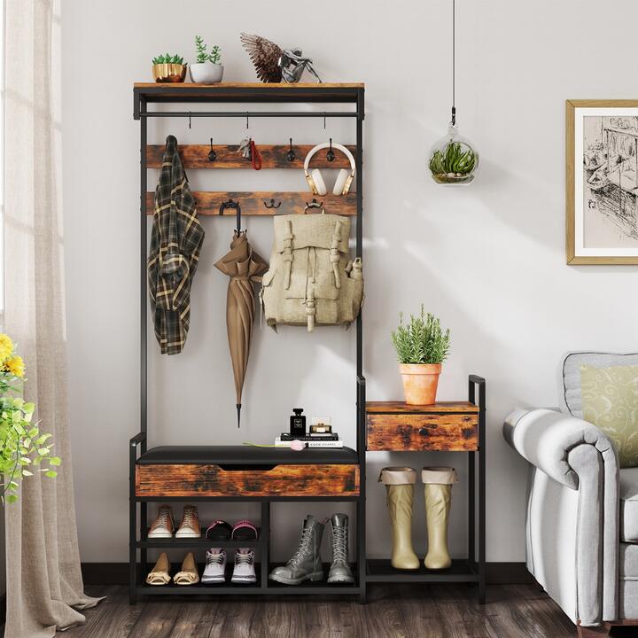 Costway178 cm Freestanding Hall Tree with Shoe Storage Bench-Brown