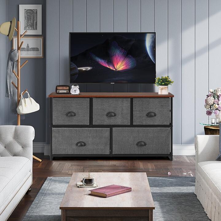 Costway5 Drawer Storage Organizer Unit with Sturdy Iron Frame Easy Pull Removable Fabric Bins-Dark Black