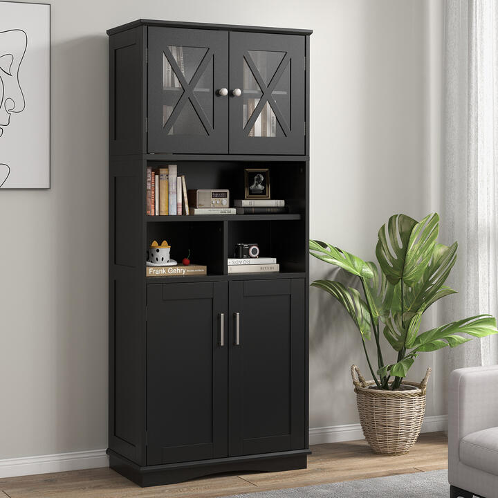 Costway179 cm Kitchen Pantry Cabinet with 4 Transparent Doors and Adjustable Shelf-Black