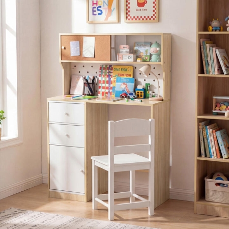 • CostwayKids Desk and Chair Set with Pegboard and Cork Bulletin Board-Natural