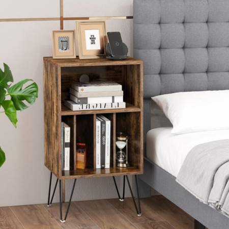 • CostwayTurntable Nightstand with Vinyl Record Storage Cabinet and Charging Station-Rustic Brown