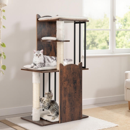 • Costway112 CM Tall Wooden Cat Tree with Removable Washable Plush Cushions-Rustic Brown