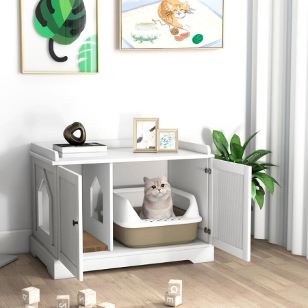 • CostwayCat Litter Box Enclosure with Double Doors & Scratch Cardboard-White