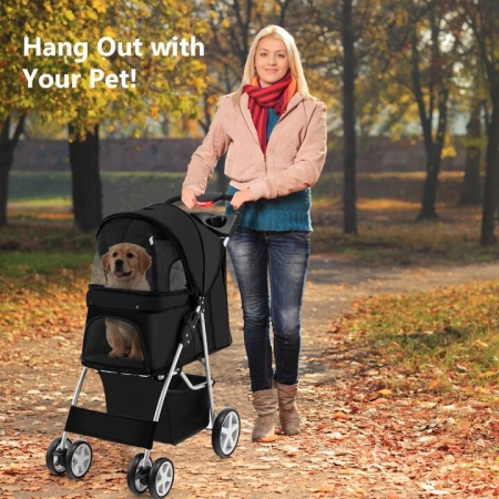 • Costway4-Wheel Folding Pet Stroller with Mesh Windows & Storage Basket-Black