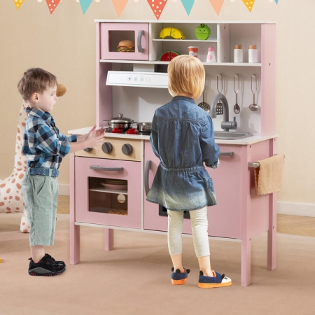 • CostwayKids Kitchen Playset Wooden Pretend Play Kitchen with Microwave-Pink