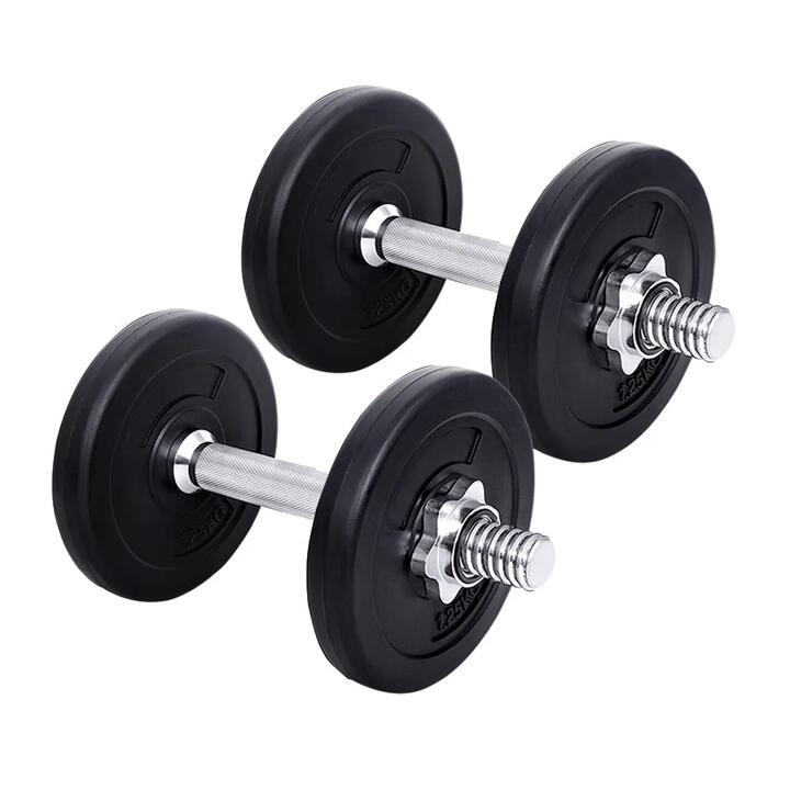 Time to get tough. If you are looking to boost those triceps, biceps and shoulders, our 10kg Dumbbell Set is the perfect deal for you. Whatever your game is, our dumbbell set lets you strengthen and tone those muscles your way. This commercial-grade set features a high-quality bar with non-slip handle that offers optimal gripping surface. Each weight plate weighs 1.25kg and is made of cast cement coated with smooth plastic, reducing clanging sounds and making them more floor-friendly. You can adjust the weight of the dumbbell by removing the weight plate and only using the dumbbell bar (weighing 2.5kg each) or adding more compatible weight plates. The high-quality star-shaped nuts ensure the weight plates stay securely in place for safe workouts. Best of all, the dumbbell comes in a set of two (two 5kg dumbbells for 10kg total) so that you can exercise both arms at the same time. Gym junkie or workout pro, you can get fit easily with our 10kg Dumbbell Set. ,Features, Commercial grade ideal for professional body workout, High quality steel bar, Plastic coated, cement filled dumbbell, Adjustable weight plates, Non-slip handle, Includes 4 weight plates, Ideal for fat-loss, building muscle strength, Specifications:, Dimensions: 45 x 18cm x 18cm, Weight plates: 4 x 1.25kg, Weight of dumbbell: 5kg, Weight of dumbbell bar & stoppers: 5kg, Plates materials: cast cement coated with plastic, Colour: Black and silver, Assembly Required: Yes, Number of packages: 1, Package Content, 1 x 10kg Dumbbell set. Note:- Actual product colours may vary due to lighting, studio photography, room conditions, different screens on various devices.