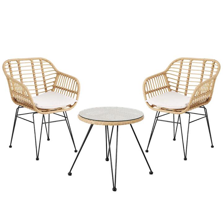 Enjoy the outdoors with the Gardeon Bistro Set. This elegant set features a sturdy steel frame with a durable, weather-resistant powder coating. Non-slip feet ensure stability, while the smooth surface allows for easy cleaning. Cushion covers are removable and washable. Assembly is simple, making it perfect for any patio or garden. Features Sturdy steel frame Durable powder coating Weather-resistant Non-slip feet Smooth surface for easy cleaning Comes with matching table Removable and washable cushion cover Easy assembly, Specifications: Material: PE wicker Frame: Steel Finish: Powder-coated Cushion material: 180G polyester Glass top thickness: 5mm Cushion thickness:3cm Colour: Natural Chair dimensions: 50cm x 46.5cm x 81cm Table dimensions: 44cm x 44cm x 41cm Assembly required : Yes Number of packages: 1, Package Content Chair X2 Table X1 Manual X1, This product comes with 1 year warranty. Note:- Actual product colours may vary due to lighting, studio photography, room conditions, different screens on various devices.