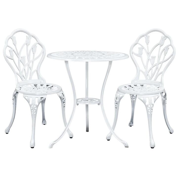 Embrace nature's serenity with our Gardeon Garden Bistro Set. Constructed from hard-wearing, weather-resistant materials, this bistro set is both functional and stylish. Its timeless design seamlessly blends with any garden setting, offering a tranquil spot to sit and appreciate the outdoors. A cherished addition to any green space. Features Classic vintage outdoor bistro set with parasol hole Equipped with rubber foot pads Rust and weather-resistant for durability User-friendly assembly and minimal upkeep, Specifications: Frame material: Cast aluminium Legs material: Cast iron Finish: Powder-coated Table weight capacity: 40kg Table size: Dia.59.5cm x H67cm Chair weight capacity: 120kg Chair size: 37cm x 41cm x 85cm Parasol hole diameter: 5cm Colour: White Assembly required: Yes Number of packages: 1, Package Content Gardeon Bistro Set x1 Assembly manual x1, This product comes with 1 year warranty. Note:- Actual product colours may vary due to lighting, studio photography, room conditions, different screens on various devices. – All our furniture product are flat pack (assembly required) for safe handling purposes.