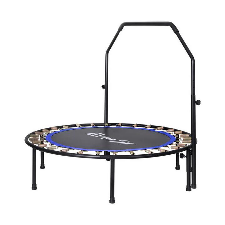Our Everfit Fitness Trampoline is designed for peak performance and space efficiency. This model boasts a sturdy heavy-gauge steel frame and high-elasticity springs, ensuring a superior bounce. The adjustable, foam-wrapped handrail and anti-slip feet guarantee safety and stability. Easy assembly and compact design make it an ideal addition to any workout space. Safety note: Suitable for children aged over 12 years. Features 48-inch Fitness Trampoline Constructed with heavy-gauge steel frame High elasticity springs for better bounce Handrail wrapped in foam for grip and comfort Adjustable handrail Anti-slip feet Space saving design Easy assembly, Specifications: Frame material: Steel Jumping mat material: PP Number of elastic springs: 30pcs Frame tube: 25mm(diameter)*1.0mm*6pcs Leg tube: 25mm(diameter)*1.0mm*6pcs Max weight capacity: 150kg Color: Blue and Black Shape: Round Assembly required: Yes No. of package: 1, Package Content Everfit Fitness Trampoline x1 Assembly manual x 1, This product comes with 1 year warranty. Note:- Actual product colours may vary due to lighting, studio photography, room conditions, different screens on various devices.