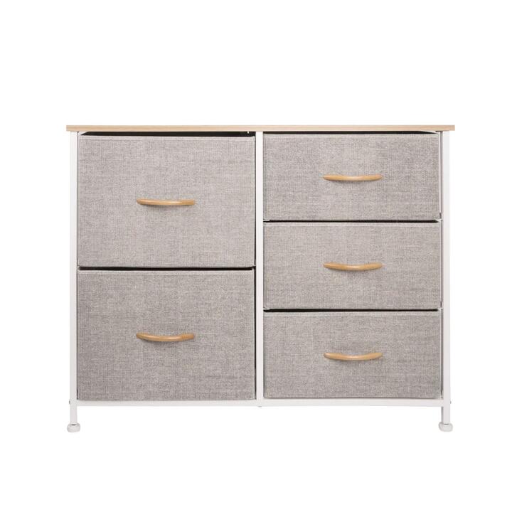 Hide away household clutter with this handy storage chest that offers ample space to store everything from documents, cords and stationary to other belongings for a neat and tidy home. Contemporary storage chest, 2 Large and 3 medium-sized drawers, Solid surface tabletop, Lightweight and easy to move, Sturdy structure, Easy to assemble, Give your home interior an instant update thanks to the 5 Drawer Storage Chest that holds everyday essentials and other common household items with modern style. Space for storage, From clothing and accessories to paperwork and cables, the two large and three medium-sized pull-out drawers are perfect for packing away any household items to maximise space anywhere around the house and keep it neat and organised. Simple style update, The simple silhouette is paired with a neutral colour palette that complements existing decor while bringing a touch of contemporary charm to the interior of any home. Dimension: W 85 x D 30 x H 70cm. Note:- Actual product colours may vary due to lighting, studio photography, room conditions, different screens on various devices. – All our furniture product are flat pack (assembly required) for safe handling purposes.