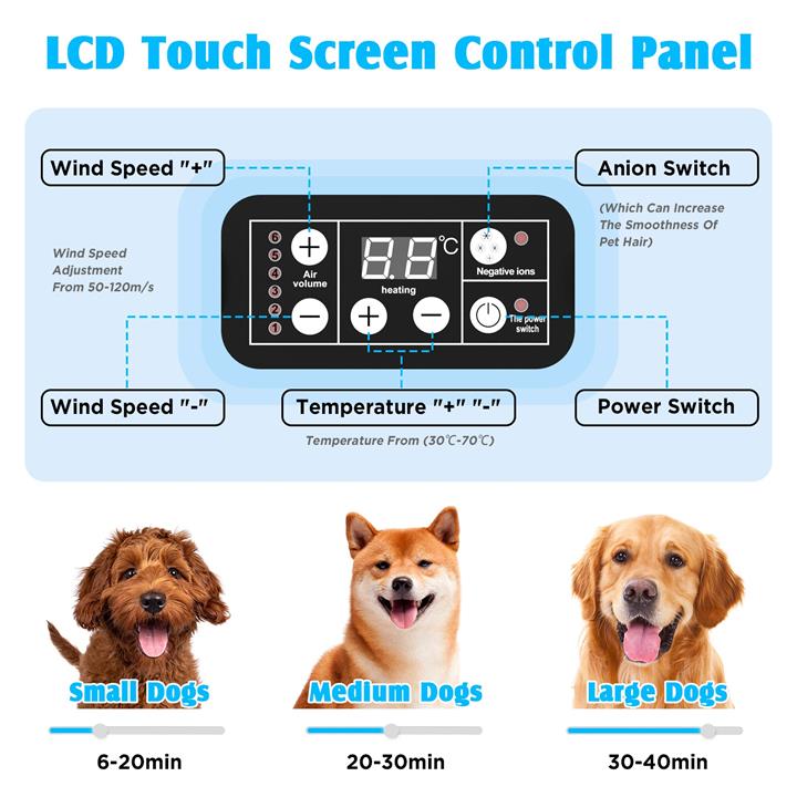 - 2000W Powerful Motor for Stepless Adjustable Blow Force: Our pet grooming hairdryer is the top groomers' choice! 2000W powerful motor provides strong blow force and cuts down drying times. You can do a full salon-grade blowout in under 15 minutes! Adjustable wind speeds of 50-120 m/s can suit all kinds of pets and all your needs.