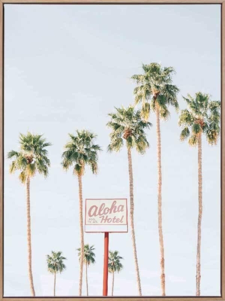 Aloha Canvas Art Print – Embrace the spirit of tropical travels with this stunning photographic art print. Showcasing a hotel sign framed by palm trees, this piece brings calming energy with a soft palette of light blue, green, and neutrals. Add this piece for vintage vibes and memories of sun-soaked getaways and tranquil coastal retreats. Get swept away in the Wanderer Collection, a series of travel photography with an evocative blend of cityscape, coastal, and vintage themes. Each art print captures the essence of wanderlust, transporting you to serene shores, bustling cities, and nostalgic moments. With a versatile colour palette that ranges from muted neutrals to vibrant hues, these photographic wall prints are perfect for any decor. Whether you seek the charm of vintage photography or the allure of coastal scenes, our collection offers something for every art lover. Elevate your space with these stunning wall art pieces and let your space tell a story of exploration and timeless beauty. Disclaimer: Colours of Urban Road products may vary due to device display differences, monitor settings, inherent product variations, lighting conditions, and screen calibration. While we strive for accuracy, slight variations may occur. For any concerns, contact our customer support. Your satisfaction is our priority. STRETCHED CANVAS Urban Road's stretched canvas fine art prints are professionally printed on polycotton artist canvas, using archival inks and then stretched and gallery wrapped. This means the image is stretched around a 38mm frame to create a seamless, museum-quality finish. All stretched and box framed art prints arrive ready to hang. SHADOW BOX FRAMES We also offer the option to add a shadow box frame to your Urban Road canvas art print. A little different from a traditional framed print, the canvas sits within the box frame with a 5mm gap, creating a sophisticated shadow effect between the frame and the canvas. Our solid timber box frame mouldings are 10mm wide, and 55mm deep, and add approximately 40mm to the length and height of the listed canvas size. ROLLED CANVAS ART At Urban Road, we also offer you the option to purchase your canvas art print unframed to allow you to have it framed your own way. As with our stretched and box framed canvas products, our rolled canvas prints are professionally printed on durable, museum-quality, matte coated polycotton canvas and made to order. Our rolled canvas products are printed to the listed stretched size, and come with an additional 45mm mirrored edge plus another 60mm white border to allow for gallery wrapping.