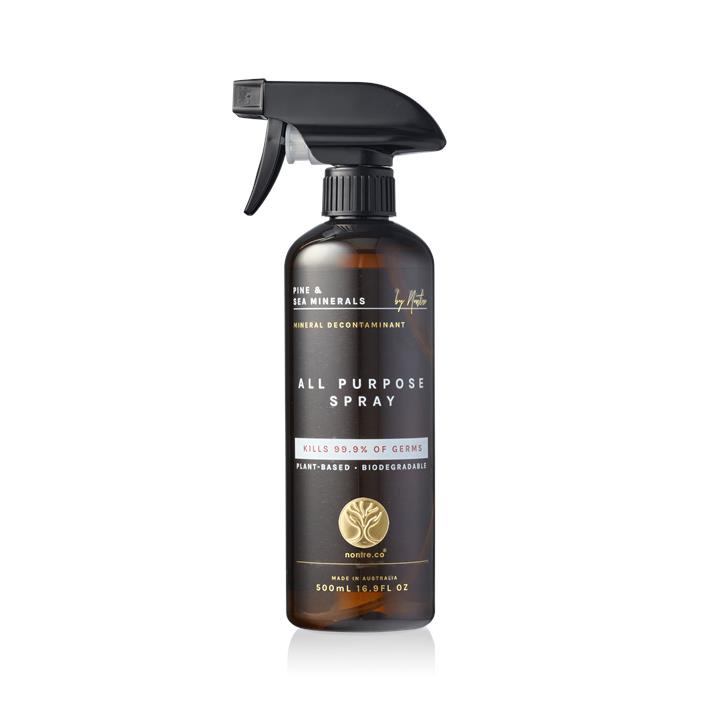 nontre's long-lasting, Antibacterial All-Purpose Spray, Pine & Sea Minerals provides a powerful solution that is tough on grease and grime, leaving behind a refreshing, crisp and earthy scent of mountain pine and sea botanicals. Scientifically tested to kill 99.9% of germs*, our all-purpose spray is 100% grey-water and septic safe and formulated to have scent longevity. This bottle is designed to be reused. Simply refill your empty 500mL bottle with nontre's Pine & Sea Minerals All-Purpose Concentrate and add water. Why use nontre's Pine & Sea Minerals All-Purpose Spray? Kills 99.9% of germs* Deep cleans as it sanitises surfaces Reusable bottle Fresh, long lasting scent How to use: Spray your surface with our All-Purpose Cleaner, holding it 20cm away from the surface. With a damp cloth, wipe the surface in an “S” shape – this prevents spreading of germs. To sanitise your surfaces, spray our All-Purpose Cleaner and let it work its magic for 5 minutes. Come back and wipe with a clean, damp cloth. Our All-Purpose Cleaner works on most surfaces including granite benchtops, stainless steel, tiles and stove tops. Specifications Quantity: 1 x 500mL bottle of Pine & Sea Minerals All-Purpose Cleaner * Officially 3rd party tested by a recognised Australian testing laboratory. Contains Aqua, fragrance, Benzalkonium Chloride, plant-based ingredients. Greywater and septic safe. Fragrance A refreshing, crisp and earthy scent of mountain pine and sea botanicals. Escape the everyday and transport your senses to a windswept shore. Top Notes: Sea Botanicals Middle Notes: Fig leaf Base Notes: Pine and Cedar