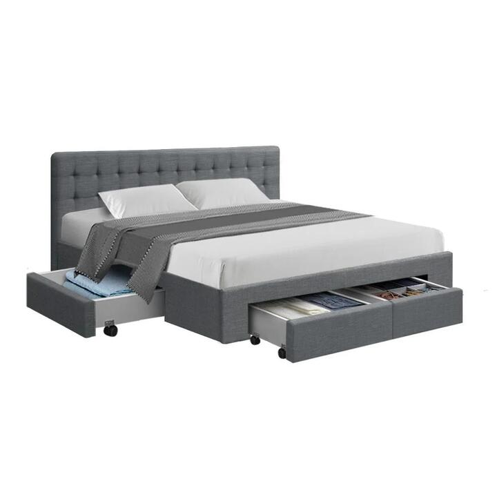 Turn your bedroom into a luxurious pad with our Avio Bed Frame. It's a stylish bed frame and so much more. Constructed with a sturdy steel frame that's reinforced with metal bars and heavy-duty connectors, the Avio Bed Frame is also padded with high density foam and upholstered in premium faux linen fabric for a soft and comfortable touch. The Bed Frame features a wooden arched slat base that helps to distribute weight evenly across the frame and a centre support strut to provide added stability to the overall structure. Of particular interest is the tufted headboard that really gives the Bed Frame a designer-class status. Simply oozing with elegance and sophistication in every detail. What's more, underneath the Bed Frame, you'll find four spacious drawers to store all your seasonal beddings and linen and a host of other personal essentials. No more clutter and loads of useable storage right under you. Better still, the drawers are set on wheels for easy access sliding in and out. The Avio Bed Frame exhibits a neutral tone that makes it very adaptable to numerous decor themes. With so much in store with our Avio Bed Frame, you should be getting yours soon. *Note: Mattress is sold separately. Features Premium linen fabric Padded with high density foam Tufted headboard Breathable non-woven fabric Sturdy steel frame Strong centre support strut Wooden arched slat base Four large storage drawers with wheels Heavy-duty metal connectors Reinforced construction with metal bars, Specifications: Material: Faux linen fabric + foam + wood Slats: Plywood Fits standard King-sized mattress: 203cm x 183cm Overall dimensions: 216cm x 194.5cm x 95cm Weight capacity: 300kg Colour: Grey Assembly required: Yes Please note: This item comes in 3 packages. Package Content Artiss Avio Bed Frame x 1 Assembly Manual x 1, This product comes with 1 year warranty. Note:- Actual product colours may vary due to lighting, studio photography, room conditions, different screens on various devices. – All our furniture product are flat pack (assembly required) for safe handling purposes.
