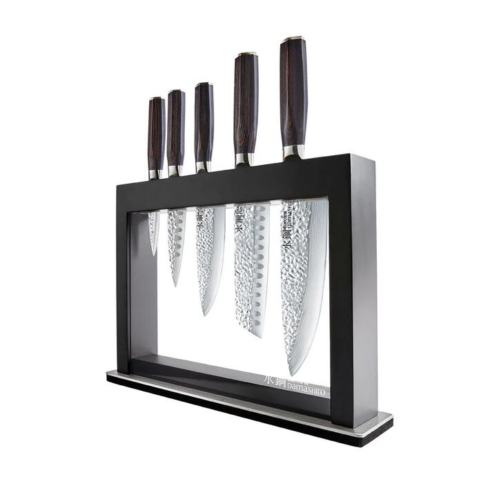 Embrace the superior craftsmanship and outstanding quality of Japanese steel with the Baccarat Damashiro™ EMPEROR Hisa 6 Piece Knife Block. This impressive knife set includes 5 of the #1 best selling kitchen blades to suit all your cooking needs & take your kitchen to the next level. Brand Credentials The Baccarat Damashiro™ EMPEROR knives have been crafted from the finest Japanese Steel 420J2, and ice-hardened ensuring superior blade strength and durability. The Damashiro™ EMPEROR range features distinctive Damascus inspired blades inspired by traditional Japanese craftsman and Samurai sword makers. Characteristic of banding and mottling reminiscent of flowing water. The Baccarat Damashiro™ EMPEROR Japanese Steel has been mined in the same Japanese region of Chuo-Ku Chiba since the middle of the last century. Each knife in the Damashiro™ EMPEROR range has been engineered and tested to meet Rockwell 53 specification, guaranteeing the blades hardness and optimum Performance. All Baccarat Damashiro™ EMPEROR knives are forged steel with traditional hammered tsuchime. Backed by the Baccarat LIFETIME GUARANTEE. Features • The Baccarat Damashiro™ EMPEROR Hisa 6 Piece Knife Block contains: 1 x 20cm Chefs Knife, 1 x 17cm Santoku Knife, 1 x 15cm Chefs Knife, 1 x 12cm Utility Knife and 1 x 9cm Paring knife. Housed in a stylish knife block to showcase your blades.• Each Damashiro™ blade undergoes a Premium Japanese leather sharpening process, providing an even sharper cutting blade• Engineered and tested to meet Rockwell 53 specification guaranteeing a blades hardness and optimum performance. Ice hardened and Twice sharpened for superior cutting edge• Forged steel with traditional hammered tsuchime• The handle is crafted from dark Pakkawood• Blade angle 15-20°• Backed by the Baccarat LIFETIME GUARANTEE Materials Japanese Steel Dimensions • 20cm Chefs Knife • 17cm Santoku Knife • 15cm Chefs Knife • 12cm Utility Knife • 9cm Paring knife