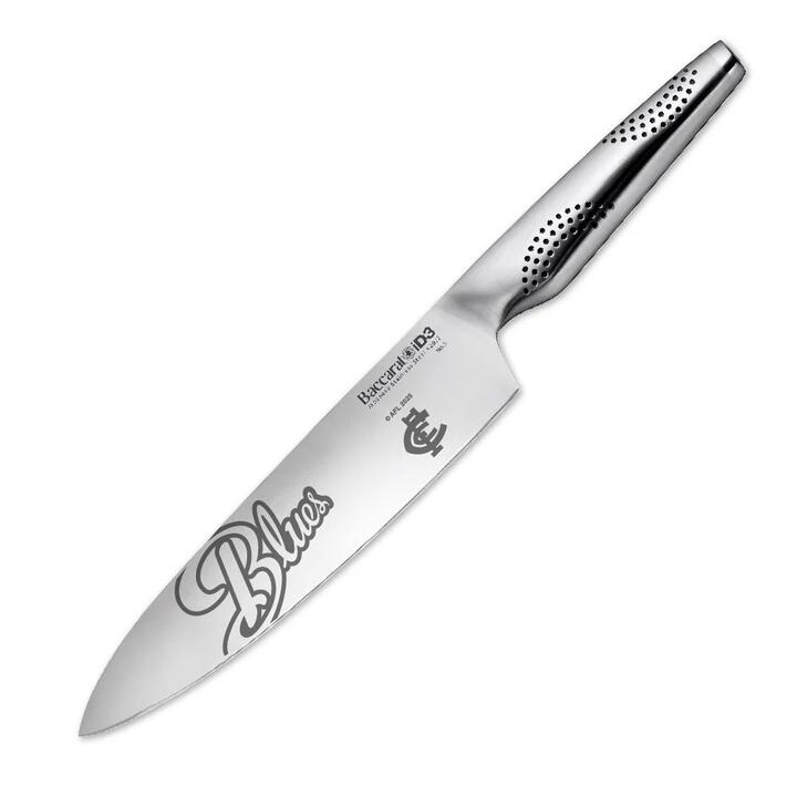 Your home for AFL Carlton Merchandise. Celebrate your beloved AFL team every day and add a cherished keepsake to your collection with the Baccarat iD3 Chefs Knife, featuring a Carlton Blues design. This knife not only serves as a functional piece but also as a memorable tribute for devoted fans and those who enjoy entertaining. The Baccarat iD3 Chefs Knife 20cm is traditionally known as a cooks knife. It is an all-purpose knife that is curved to allow the Cook to rock the knife on the cutting board for a more precise cut. BRAND CREDENTIALSBaccarat iD3 knives are crafted from the finest Japanese Steel 420J2. The Japanese steel blade construction has been inspired by century old manufacturing techniques favored by traditional Japanese craftsman and Samurai sword makers, to create a super sharp cutting edge which holds a greater edge retention. The blades are ice-hardened ensuring superior blade strength and durability. The iD3 Japanese Steel has been mined in the same Japanese region of Chuo-Ku Chiba since the middle of the last century. Each knife in the iD3 range has been engineered and tested to meet Rockwell 53 specification guaranteeing the blades hardness, and optimum performance. The Baccarat Trademarked MicroDot Technology is used exclusively in the iD3 range of knives. The MicroDot Technology is evident on the knives handle, and is used to comfort your hands main pressure points, ensuring complete control and precision when slicing. Backed by the Baccarat LIFETIME GUARANTEE. Please Note: Due to the customising process, please allow 2 weeks for delivery of your order. Features •Boasts a Carlton Blues design • The Baccarat iD3 Chefs Knife is an all-purpose knife that is curved to allow the cook to rock the knife on the cutting board for a more precise cut. • The asymmetrical handle design of the Baccarat iD3 combined with the trademarked MicroDot Technology, provides more grip and safer knife control • Ice hardened and twice sharpened for superior cutting edge • Rockwell Hardness tested for strength • Forged steel with one-piece seamless handle • The handle is weight balanced and features the Trademarked MicroDot Technology. Blade angle 15-20° • Backed by the Baccarat LIFETIME GUARANTEE Dimensions• 20cm (L) MaterialJapanese Steel