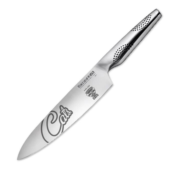 Your home for AFL Geelong Merchandise. Celebrate your beloved AFL team every day and add a cherished keepsake to your collection with the Baccarat iD3 Chefs Knife, featuring a Geelong Cats design. This knife not only serves as a functional piece but also as a memorable tribute for devoted fans and those who enjoy entertaining. The Baccarat iD3 Chefs Knife 20cm is traditionally known as a cooks knife. It is an all-purpose knife that is curved to allow the Cook to rock the knife on the cutting board for a more precise cut. BRAND CREDENTIALSBaccarat iD3 knives are crafted from the finest Japanese Steel 420J2. The Japanese steel blade construction has been inspired by century old manufacturing techniques favored by traditional Japanese craftsman and Samurai sword makers, to create a super sharp cutting edge which holds a greater edge retention. The blades are ice-hardened ensuring superior blade strength and durability. The iD3 Japanese Steel has been mined in the same Japanese region of Chuo-Ku Chiba since the middle of the last century. Each knife in the iD3 range has been engineered and tested to meet Rockwell 53 specification guaranteeing the blades hardness, and optimum performance. The Baccarat Trademarked MicroDot Technology is used exclusively in the iD3 range of knives. The MicroDot Technology is evident on the knives handle, and is used to comfort your hands main pressure points, ensuring complete control and precision when slicing. Backed by the Baccarat LIFETIME GUARANTEE. Please Note: Due to the customising process, please allow 2 weeks for delivery of your order. Features •Boasts a Geelong Cats design • The Baccarat iD3 Chefs Knife is an all-purpose knife that is curved to allow the cook to rock the knife on the cutting board for a more precise cut. • The asymmetrical handle design of the Baccarat iD3 combined with the trademarked MicroDot Technology, provides more grip and safer knife control • Ice hardened and twice sharpened for superior cutting edge • Rockwell Hardness tested for strength • Forged steel with one-piece seamless handle • The handle is weight balanced and features the Trademarked MicroDot Technology. Blade angle 15-20° • Backed by the Baccarat LIFETIME GUARANTEE Dimensions• 20cm (L) MaterialJapanese Steel