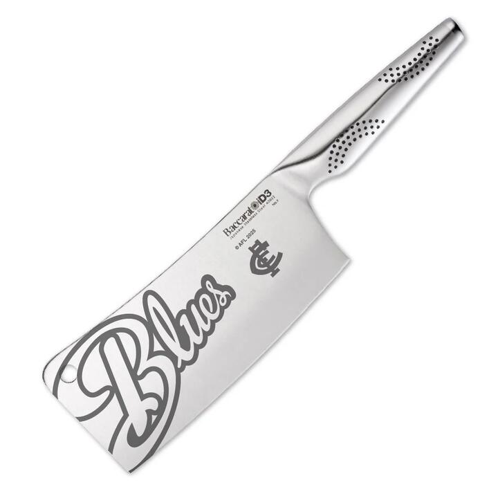 Your home for AFL Carlton Merchandise. Celebrate your beloved AFL team every day and add a cherished keepsake to your collection with the Baccarat iD3 Cleaver, featuring a Carlton Blues design. This knife not only serves as a functional piece but also as a memorable tribute for devoted fans and those who enjoy entertaining. The Baccarat iD3 Cleaver 17.5cm has been engineered and weighted to make heavy chopping easier. A cleaver can take on heavier root vegetables with more force than a chef's knife or santoku knife. Aside from breaking down tendons, cleavers can also be used for pounding, mincing, dicing, and slicing a variety of other foods. BRAND CREDENTIALSBaccarat iD3 knives are crafted from the finest Japanese Steel 420J2. The Japanese steel blade construction has been inspired by century old manufacturing techniques favored by traditional Japanese craftsman and Samurai sword makers, to create a super sharp cutting edge which holds a greater edge retention. The blades are ice-hardened ensuring superior blade strength and durability. The iD3 Japanese Steel has been mined in the same Japanese region of Chuo-Ku Chiba since the middle of the last century. Each knife in the iD3 range has been engineered and tested to meet Rockwell 53 specification guaranteeing the blades hardness, and optimum Performance. The Baccarat Trademarked MicroDot Technology is used exclusively in the iD3 range of knives. The MicroDot Technology is evident on the knives handle, and is used to comfort your hands main pressure points, ensuring complete control and precision when slicing. Backed by the Baccarat LIFETIME GUARANTEE. Please Note: Due to the customising process, please allow 2 weeks for delivery of your order. Features• Boasts a Carlton Blues design • The Baccarat iD3 Cleaver Knife blade will change the way you handle meats. In addition to being designed for portioning of poultry and varied cuts of meats, the Cleaver is perfect for cutting through heavier root vegetables with ease. It is engineered to be perfectly balanced and weighted, making chopping a breeze.• The asymmetrical handle design of the Baccarat iD3 combined with the trademarked MicroDot Technology, provides more grip and safer knife control• Ice hardened and twice sharpened for superior cutting edge• Rockwell Hardness tested for strength• Forged steel with one-piece seamless handle• The handle is weight balanced, and features the Trademarked MicroDot Technology. Blade angle 15-20°• Backed by the Baccarat LIFETIME GUARANTEE Dimensions17.5 x 8cm MaterialJapanese Steel