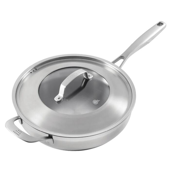 The Baccarat iD3 SS Saute Pan with Helper Handle and Lid is an essential cookware item for every kitchen, composed of the finest grade 18/10 stainless steel and featuring a sturdy 5mm impact bonded base that works to distribute heat accurately eliminating hot spots. The ergonomically designed curved handles ensures the ultimate comfort and style, and functionally oven and dishwasher safe. Engineered with a sleek satin finish exterior, stay-cool cast stainless steel handles, and easy-to-clean mirror finish interior, the Baccarat iD3 Saute Pan will elevate everyday cooking to a professional level. For your convenience, the Baccarat iD3 SS range is dishwasher safe and works with all cooktops, including induction. The Baccarat Trademarked MicroDot Technology is used exclusively in the iD3 range. The MicroDot Technology is evident on the frypan handle and is used to comfort your hands main pressure points, ensuring complete control and precision when cooking. Backed by the Baccarat LIFETIME GUARANTEE. Features • Sturdy 5mm core ensures efficient and rapid heat transfer eliminating hot spots • The handle is ergonomically curved and comprises MicroDot technology for the ultimate comfort while cooking • Constructed of the highest quality 18/10 stainless steel • Oven safe up to 220°C – when using the lid up to 180°C • Chemical free – free from PTFE, PFAS, PFOA, Lead and Cadmium • Suitable for all cooktops including induction • Backed by the Baccarat LIFETIME GUARANTEE What Am I Buying 1 x Saute Pan Materials Stainless Steel Dimensions 28cm diameter x 6cm Capacity 3.2L