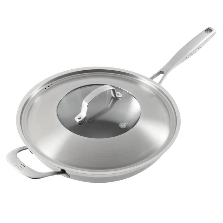 The Baccarat iD3 SS Wok with Helper Handle and Lid is an essential cookware item for every kitchen, composed of the finest grade 18/10 stainless steel and featuring a sturdy 5mm impact bonded base that works to distribute heat accurately eliminating hot spots. The ergonomically designed curved handles ensures the ultimate comfort and style, and functionally oven and dishwasher safe. Engineered with a sleek satin finish exterior, stay-cool cast stainless steel handles, and easy-to-clean mirror finish interior, the Baccarat iD3 Wok will elevate everyday cooking to a professional level. For your convenience, the Baccarat iD3 SS range is dishwasher safe and works with all cooktops, including induction. The Baccarat Trademarked MicroDot Technology is used exclusively in the iD3 range. The MicroDot Technology is evident on the frypan handle and is used to comfort your hands main pressure points, ensuring complete control and precision when cooking. Backed by the Baccarat LIFETIME GUARANTEE. Features • Sturdy 5mm core ensures efficient and rapid heat transfer eliminating hot spots • The handle is ergonomically curved and comprises MicroDot technology for the ultimate comfort while cooking • Constructed of the highest quality 18/10 stainless steel • Oven safe up to 220°C – when using the lid up to 180°C • Chemical free – free from PTFE, PFAS, PFOA, Lead and Cadmium • Suitable for all cooktops including induction • Backed by the Baccarat LIFETIME GUARANTEE What Am I Buying 1 x Wok Materials Stainless Steel Dimensions 32cm diameter x 9cm Capacity 5L