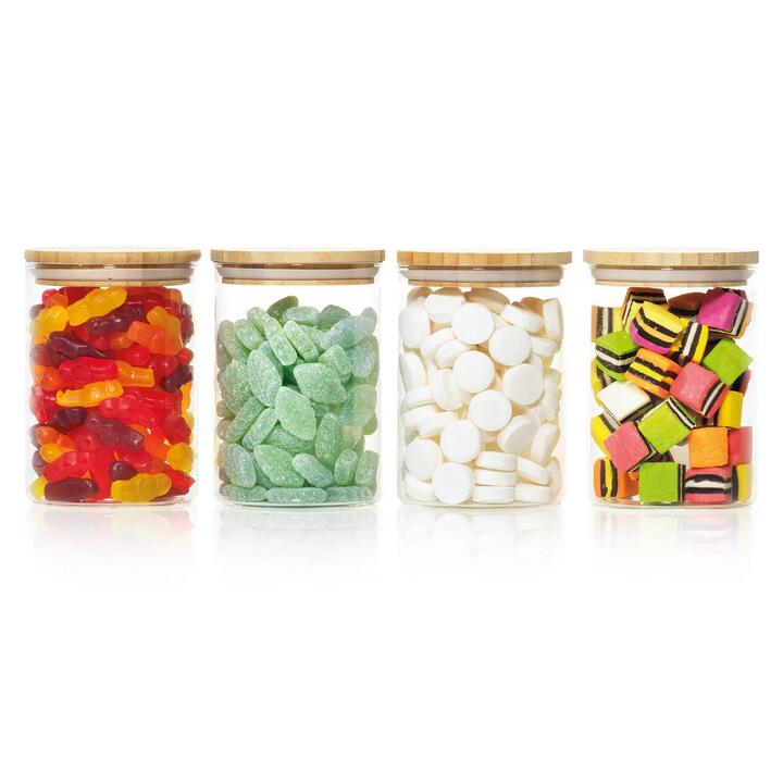 The Scullery Bamboo 4 Piece Round Canister Set features clear, stackable storage canisters that are ready to be filled with your favourite dry goods. The airtight lids are crafted from bamboo, making canisters an environmentally friendly and space-saving option. Bamboo is a hard grass that is sustainable and a renewable resource that needs no chemicals to thrive or be harvested. The body of the canister is made from borosilicate glass, which leaves a smooth and polished finish while being resistant to stains, food odours, germs, or even smells seeping into your glass containers. Maximize your pantry space as these canisters are stackable and will easily store and organise your ingredients or snacks! Features • Set includes 4 x 750ml Canisters • Bamboo lids offer an airtight seal, keeping food fresher for longer • Body of the canisters made from high quality borosilicate glass • Perfect for storing dry food, snacks or dehydrated fruits! • Clear glass container allows you to easily view and identify the contents • Naturally hygienic bamboo lid, which is environmentally friendly Materials Bamboo Dimensions 10 x 13cm What Am I Buying 4 x Canisters with matching lids