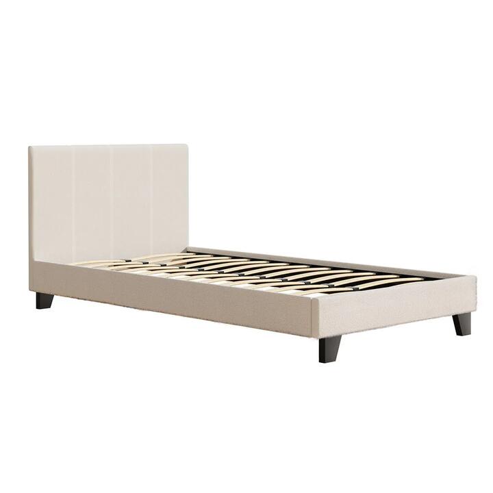 Add a touch of cosiness to your bedroom with our Artiss Neo bed frame. Wrapped in premium boucle fabric, the bed frame is aesthetically pleasing and extremely pleasant and smooth to touch. It will make you feel comfortable. The bed frame comes attached with a textured bed head. It has high-density foam padding, which makes it a cosy spot to sit back and relax, watch a movie, or read a book. Furthermore, the wooden arched slatted base allows the bed flex properly. It prevents partner disturbance. The slats are quite thick and will provide good support to your mattress. This bed frame has premium heavy-duty metal fixings and solid legs. So you don not have to worry about stability. It will keep the bed stable and prevent shaking. Additionally, this bedframe is available in single, king single, double, and queen and fits Australian standard size mattresses. And the gorgeous cream shade enables you to style it in any bedroom style. It will seamlessly blend in your home decoration. Note: Mattress is sold separately. This product comes with one year warranty. Features Premium boucle fabric upholstery Textured bedhead High-density foam padding Solid and durable construction Reinforced wooden construction Wooden arched slat base Smooth finished edges High-quality metal fixings Strong and stable legs Easy assembly *Note: The actual colours may vary due to differences in monitor colour depth and make. Specifications: Material: Acrylic boucle fabric + foam + wood Slats: Plywood Fits standard King-Single-sized mattress: 203cm x 107cm Overall dimensions: 215cm x 114cm x 89cm Weight capacity: 150kg Colour: White Assembly required: Yes Please note: This item comes in two packages. Package Content Artiss Neo Bed Frame x 1 Assembly Manual x 1, This product comes with 1 year warranty. Note:- Actual product colours may vary due to lighting, studio photography, room conditions, different screens on various devices. – All our furniture product are flat pack (assembly required) for safe handling purposes.