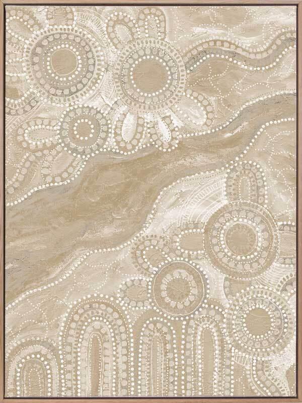 Bila lll Neutral Canvas Art Print – Let your walls tell a story with this stunning Aboriginal artwork by Wiradjuri artist, Amanda Hinkelmann. Using traditional Indigenous dot painting techniques, this piece bursts to life with an intricate design, featuring flowing lines and circular shapes. With a neutral palette of light beige shades, this piece will bring a soft, calming feel to any room. The river, a vital life source, sustains life around it, its mighty body moving through the land, ebbing and flowing with each season. This piece depicts the communities around the Murrumbidgee River, living from its resourcesfishing, swimming, foraging its shores. It represents the river as the lifeblood, a natural resource that gives much yet demands respect. This is my home on the Murrumbidgee River. These are my communities and my stories. Urban Road is committed to investing a stream of ongoing financial support back to our artist community. For every artwork sold, a percentage of the sale price goes directly back to the artist. This versatile collection of Indigenous art by renowned Wiradjuri artist, Amanda Hinkelmann, features an expressive neutral palette in multiple colourways, including muted brown, blue, green, and pink tones. Perfect for celebrating NAIDOC Week 2024, these Aboriginal art pieces bring warmth, comfort, and a touch of elegance to your space. Support First Nations art and let your walls tell stories rich in culture and heritage.
