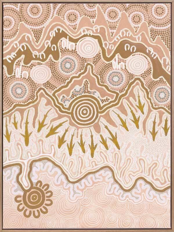 Birrbay Connection Canvas Blush Pink Art Print – Elaborate and detailed, this spectacular Aboriginal Wall Art features a breathtaking design that adds depth and interest to your space with an adventurous feel. This piece will transform your room with meticulously placed lines, dots and circles created using traditional Aboriginal Art techniques by a local Aboriginal Artist. A soft palette of blush pink and light brown tones gives this Aboriginal Art print a versatile look for any interior style. Urban Road is committed to investing a stream of ongoing financial support back to our Artist community. For every artwork sold, a percentage of the sale price goes directly back to the Indigenous Artist. Bringing you a brand-new range of traditional Aboriginal art for sale, the sixth instalment to our Aboriginal wall art Australia collection takes an intricate look at Dreamtime storytelling by several coveted Aboriginal artists. Each of these modern Aboriginal artworks have their own story and meaning, with the artists drawing on upon their personal life experiences, exuding strength, resilience, and a profound sense of connection. Immerse yourself in a vibrant spectrum of colours, from bright and warm to subdued, soft and neutral, making this collection an ideal complement to any interior style. The use of striking patterns and shapes bring a vibrant, moving energy to any room, with the option for a framed canvas print to elevate your space. Buy an Aboriginal artwork online today and honour the Aboriginal culture and the remarkable artistic traditions that have shaped generations. Disclaimer: Colours of Urban Road products may vary due to device display differences, monitor settings, inherent product variations, lighting conditions, and screen calibration. While we strive for accuracy, slight variations may occur. For any concerns, contact our customer support. Your satisfaction is our priority. STRETCHED CANVAS Urban Road's stretched canvas fine art prints are professionally printed on polycotton artist canvas, using archival inks and then stretched and gallery wrapped. This means the image is stretched around a 38mm frame to create a seamless, museum-quality finish. All stretched and box framed art prints arrive ready to hang. SHADOW BOX FRAMES We also offer the option to add a shadow box frame to your Urban Road canvas art print. A little different from a traditional framed print, the canvas sits within the box frame with a 5mm gap, creating a sophisticated shadow effect between the frame and the canvas. Our solid timber box frame mouldings are 10mm wide, and 55mm deep, and add approximately 40mm to the length and height of the listed canvas size. ROLLED CANVAS ART At Urban Road, we also offer you the option to purchase your canvas art print unframed to allow you to have it framed your own way. As with our stretched and box framed canvas products, our rolled canvas prints are professionally printed on durable, museum-quality, matte coated polycotton canvas and made to order. Our rolled canvas products are printed to the listed stretched size, and come with an additional 45mm mirrored edge plus another 60mm white border to allow for gallery wrapping.