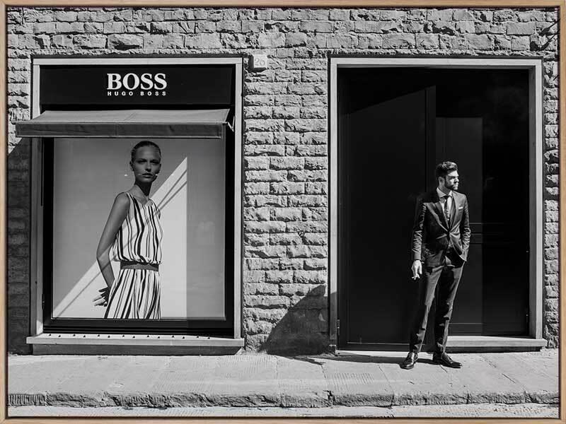 Boss Canvas Art Print – A black and white photograph of man smoking outside of a Hugo Boss storefront. THE CURATED SERIES A handpicked gallery of daringly quirky photographic pieces exploding with richness of colour and texture. Disclaimer: Colours of Urban Road products may vary due to device display differences, monitor settings, inherent product variations, lighting conditions, and screen calibration. While we strive for accuracy, slight variations may occur. For any concerns, contact our customer support. Your satisfaction is our priority. STRETCHED CANVAS Urban Road's stretched canvas fine art prints are professionally printed on polycotton artist canvas, using archival inks and then stretched and gallery wrapped. This means the image is stretched around a 38mm frame to create a seamless, museum-quality finish. All stretched and box framed art prints arrive ready to hang. SHADOW BOX FRAMES We also offer the option to add a shadow box frame to your Urban Road canvas art print. A little different from a traditional framed print, the canvas sits within the box frame with a 5mm gap, creating a sophisticated shadow effect between the frame and the canvas. Our solid timber box frame mouldings are 10mm wide, and 55mm deep, and add approximately 40mm to the length and height of the listed canvas size. ROLLED CANVAS ART At Urban Road, we also offer you the option to purchase your canvas art print unframed to allow you to have it framed your own way. As with our stretched and box framed canvas products, our rolled canvas prints are professionally printed on durable, museum-quality, matte coated polycotton canvas and made to order. Our rolled canvas products are printed to the listed stretched size, and come with an additional 45mm mirrored edge plus another 60mm white border to allow for gallery wrapping.