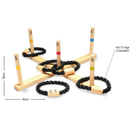 BS Toys – Ring Toss – Quoits GameA classic family throwing game that will challenge the young and old alike, this ring toss set features 5 wooden posts with rope rings for players to throw and score.All that is needed is a good eye and steady arm. Toss the rings over the pegs to win points. Set how many points you would like to play to then the first player to reach that target is the winner!!Ideal for the beach and parks.Features:5 wooden posts with varying scores5 x rings ( including 1 doubler scoring ring _Materials: Wood/ropeRecommended for ages 6+ yearsDimensions (approx. cm): 50 x 10 (W x H)