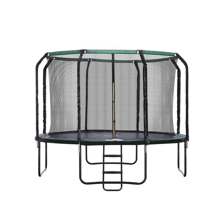 DESCRIPTION Start by doing jumping jacks on you round trampoline. Move on to tuck jumps and squat jumps . Do a seat drop. Now trying bouncing on one leg. After some practice you might be able to do a flip. Kids just want to have fun on their kids trampoline. Supervise your kids first. Make sure they understand how to safely jump on their kids trampoline. After that, you can let them outside to play by themselves. The challenge of fitness is finding the time or the place. The place is your trampoline with sides . The time is any time you are at home. Anyone in your family can bounce and jump on your new trampoline. Climb the trampoline ladder inside. Bounce. Bounce higher. Let the trampoline springs and trampoline mat fling you higher . Or you can start jogging on your trampoline. Help your kids do some advanced tricks on their large trampoline. Throw them a ball. Soon they will be able to catch it. Now the challenge is to through back to you. They can try throwing while doing a somersault. Key features, No sharp corners, Strong and durable, Thick padding, Densely woven nets, UV-resistant, Bouncy, Smooth touch, Step ladder, Foam-wrapped steel poles, Basketball thrills, , Note 1 : We recommend wearing gloves when assembling your trampoline. Note 2 : Basketball, hoop and pump are sold separately. Safety note: Suitable for children aged over 6 years. SPECIFICATIONS Brand: Centra, Trampoline, Frame material: Galvanised steel, Ladder: Galvanised steel, Colour matching cover: Top PVC + fibreglass rod, Net: PE (Polyethylene), Mat: PE and PVC (Polyethylene and polymerizing vinyl chloride), Padding: EPE (Expanded polyethylene), Padding thickness: 12mm, Pole size: 25mm diameter. 1.1mm wall thickness. Colour: Black, 8FT, Weight capacity: 100kg, Numbers of poles: 12, Spring quantity: 48, Spring length: 140mm, Net height: 150cm, Mat to ground distance: 50cm, Dimensions: 2.43m x 2m (Dia x H), 10FT, Weight capacity: 150kg, Numbers of poles: 16, Spring quantity: 64, Spring length: 140mm, Net height: 183cm, Mat to ground distance: 76cm, Dimensions: 3.04m x 2.59m (Dia x H), 12FT, Weight capacity: 150kg, Numbers of poles: 16, Spring quantity: 72, Spring length: 140mm, Net height: 183.cm, Mat to ground distance: 80cm, Dimensions: 3.65m x 2.63m (Dia x H), Trampoline Basketball Set, Material: PVC, Dimension:, Basketball board:56cm x 35.5cm (L x W ), Basketball board thickness:1.8cm, Ball diameter:15cm, Pump length:28cm, Colour: Orange PACKAGE CONTENT, 1 x Centra Trampoline, 1 x Centra Ladder, 1 x Centra Trampoline Basketball Set(Optional), 1 x Instruction Manual. Note:- Actual product colours may vary due to lighting, studio photography, room conditions, different screens on various devices.