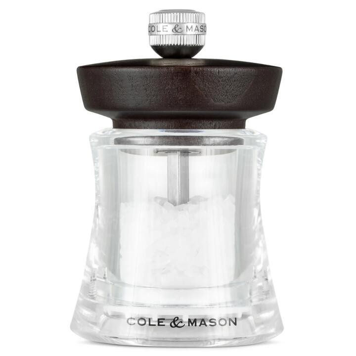 Made from durable acrylic and high-grade beech wood and standing only 95mm tall, with its squared edges and stainless-steel collar, the Cole & Mason Holborn 95mm Salt Mill has a contemporary and bold yet timeless aesthetic. Its innovative design and premium quality are synonymous with the Cole & Mason brand. The versatility of the acrylic finish makes this mill perfect for both traditional and modern kitchens. Easily adjust the grind from fine to coarse by turning the knob on the top of the mill. Made from durable acrylic and high-grade beech wood. Features• Fitted with an ultra-sharp ceramic mechanism which does not corrode with time• Comes partially filled• To clean, wipe the mill with a damp cloth and use a clean cloth to dry• We recommend you do not use any cleaning products as this can affect the aesthetic finish of the product• Do not immerse in water or place in a dishwasher• All Cole & Mason salt and pepper mills are covered by a lifetime mechanism guaranteeWhat Am I Buying1 x Salt MillMaterialsAcrylic, WoodDimensions6.1cm x 6.1cm x 9.5cm
