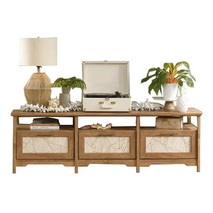 Is your home beginning to look a little boring and bland? Add a fresh new look of tropical-inspired design and beauty to any room with this credenza from the Coral Cape collection. This TV stand accommodates up to a 70” TV, making it the perfect spot for binge watching your favorite show or catching the big game. This entertainment credenza's spacious open shelf provides you with room for audio/video components and home décor items like framed photos and knick-knacks. This TV credenza features three drawers that open and close on smooth metal runners for easy access storage of items like board games, stacks of books, and other miscellaneous goodies. Each drawer includes a reversible drawer panel features a banana leaf abstract on one side and a wood pattern on the other. This credenza with doors also includes cord management so you can keep wires organized and out of sight. Finished in Sindoori Mango® and detailed with attractive hardware, this credenza will be the center of attention in your home. Features, Can holds up to a 70" TV, Three drawers with safety stops for easy storage, Reversible door panel features banana leaf abstract or wood pattern, Cable management system, Dimensions, W 170.7 x D 48.2 x H 53.3 cm, Dispatch Timing, Normally dispatched within 3 business days, Notes, This item is applicable for 7-Days change of mind policy only. Note:- Actual product colours may vary due to lighting, studio photography, room conditions, different screens on various devices. – All our furniture product are flat pack (assembly required) for safe handling purposes.