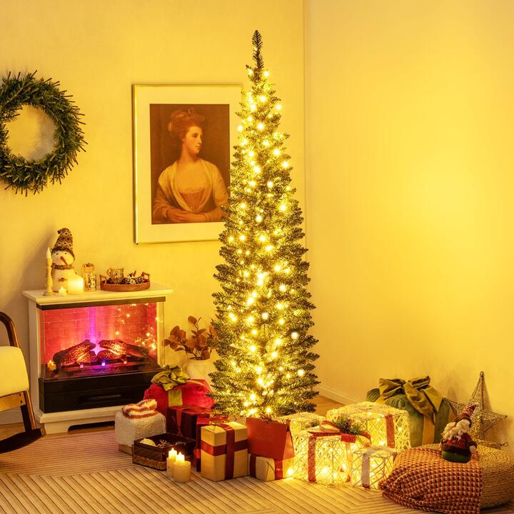 Our pre-lit Christmas tree is bound to captivate your holiday spirit! The Christmas tree is designed with 250/350/470/591 simulated branch tips to create a lush and realistic appearance. These branch tips are crafted from non-fading PVC material, ensuring a long-lasting and allergy-free display. Safety is a top priority, as the selected material is flame-retardant. To add the festival vibe at day and night, the tree is adorned with 150/180/200/300 warm white LED lights. Stability is ensured with a sturdy metal base, reducing the risk of tipping over. Additionally, the base is designed with anti-slip pads to prevent any scratches or damage to your floors. Thanks to pencil shape, the Xmas tree is ideal for small spaces, such as home, office, cafe, store. Bullet Point: Space-saving Vivid Decor: Featuring a total of 296/390/499/591 vacant branch tips, the artificial Christmas tree presents a lush and realistic appearance. Additionally, with slim shape, the Xmas tree can perfectly fit into any limited area, bringing joy to every corner of your home. Enchanting Illumination: Equipped with 150/180/200/300 warm white LED lights, the fake Christmas tree provides a soft and inviting glow, adding a touch of elegance to your holiday decor. And the energy-saving LED lights are low-voltage for safe use. 100% Premium New PVC: Each branch tip is made from high-quality non-fading PVC material, ensuring a long-lasting display. Meanwhile, the material is flame-retardant and allergy-free, enabling your family to enjoy the beauty of a lush Xmas tree without any concerns. Metal Stand Adds Stability: The metal base is designed with anti-slip pads, providing stability for the Christmas tree while preventing any potential harm to your floor surfaces. Besides, the metal stand is foldable for easy storage and setup. Extra Gift for Safe Assembly: Setting up the pre-lit pencil tree is a breeze with sectioned trunks. Then you need to fluff the leaves to get a full-bodied shape. Features: 296/390/499/591 verdant branch tips create full and lush appearance 250/350/470/591 LED lights create warm and delightful vibe Flame-retardant PVC material is non-fading and odorless SAA certified adaptor ensures safe usage Metal stand comes with 3 screws to fix the tree Metal legs with non-slip pads protect the floor Metal stand is foldable for easy storage Slim shape is perfect for small spaces Simple assembly is assured with sectioned design Specification: Color: Green Material: PVC, Metal Tree Height: 150 cm, 180 cm, 210 cm, 240 cm Tree Width: 34 cm, 38 cm, 42 cm, 45 cm Diameter of Metal Base: 35 cm, 40 cm, 50 cm, 50 cm Number of Branch Tips: 296, 390, 499, 591 Number of LED Lights: 150, 180, 200, 300 Number of Sections: 2, 3, 3, 4 Net Weight: 2.5 kg, 3 kg, 4 kg, 5 kg, 7 kg Package includes: 1 x Pre-lit Christmas Tree 1 x User’s Manual Box Qty:1(May vary by batch)