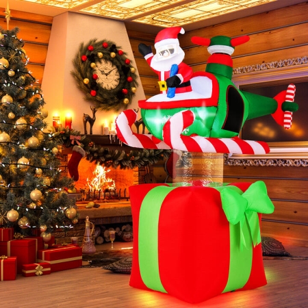 Santa waves merrily atop a red gift box, while the propellers spin, casting a spell of holiday cheer. Illuminated by 3 cold white LED lights, this energy-saving decoration is certified safe by SAA standards. Crafted from 210T polyester, it is all-weather and can stay vibrant throughout the entire holiday season. The self-inflating mechanism and zippered closure ensure effortless setup and storage. Complete with 4 water bags, 4 ground stakes, and 2 wind ropes, the yard decoration is ready to be the centerpiece of your holiday display. Bullet Point: Unique Santa Claus Helicopter Design: A cool Santa Claus, waving, pilots a helicopter while perched atop a large, vibrant red gift box. Air is cleverly expelled from exhaust ports at each propeller, creating a magical spinning motion that delights all ages. Attractive LED-Lighted Decoration: 3 built-in LED lights emit a bright glow, enhancing the holiday atmosphere while also being energy efficient. In addition, the Christmas decoration boasts SAA certifications for ensured using safety. All-Weather Polyester Fabric: Made of 210T polyester fabric, the Xmas inflatables becomes tear-proof and wear-proof, perfect for both indoor and outdoor decoration. Besides, the anti-fading material will maintain vibrant colors for a long time. Swift Inflation and Deflation: The self-inflating blower ensures the yard decoration inflates quickly and effortlessly. The clever zippered design accelerates the deflation, making it convenient to pack away when the season ends. Full Accessory Set: The blowup Santa Claus decoration comes with a comprehensive set of accessories to ensure it stands securely in place. Included are 4 water bags, 4 ground stakes, and 2 robust wind ropes. Specifications: Color: Multi-Color Material: 210T Polyester Fabric Overall Dimensions: 150 x 90 x 183 cm (L x W x H) Length of Power Cord: 280 cm Net Weight: 1.5 kg Is Assembly Required: Yes Box Qty: 1(May vary by batch)Package Includes: 1 x Christmas Inflatables 4 x Water Bags 4 x Ground Stakes 2 x Wind Ropes 1 x User Guide