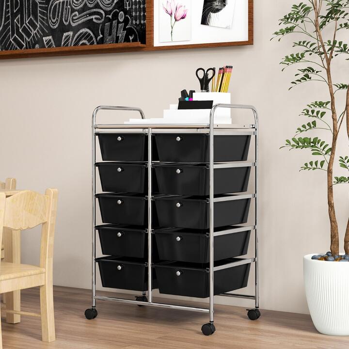 Check out this practical storage cart! This 10-drawer storage cart is perfect for all your storage needs and makes it easy to categorize your belongings. The drawers are easy to pull out with the handles. 4 wheels and handles on both sides make it easy to move the cart around, whether it's on the hardwood, tile or carpet. Two of the wheels can be locked to secure the cart. You can freely pull or push drawers. What's more, if need, you can fully remove drawers from shelf. (Tips: When stuff inside, please timely push back drawers to prevent it topple over.) The high-quality metal frame provides excellent load-bearing capacity and the rust-resistant coating increases the life of the trolley. You can place this practical modern cart anywhere in your kitchen, living room or office. Bullet Point: Ample Storage Space: Our ten drawer storage trolley not only meets your daily storage needs, but also allows you to categorize your items. The extra knobs make it easy for you to reach interior items. In addition, our storage cart also has a spacious top for you to place frequently used items.Quality Materials and Fine Craftsmanship: Our storage trolley is made of heavy-duty metal frame, which is very stable in structure. The metal parts are treated with anti-rust coating, perfect for long-term use. More, the drawers are lightweight and easy to move, as well as having great stability and won't deform easily.Easy to Move: Our storage trolley is equipped with four smooth universal wheels, which will not make noise when moving. Two of the wheels are lockable, which makes the storage cart can be fixed anywhere. In addition, the handles on both sides make it easy for you to push and pull the storage trolley.Suitable for Various Scenarios: Our storage trolley has a compact size and does not take up too much valuable floor space. You can put this cart in your kitchen, bedroom, living room, office or garage. With it, your room will no longer be cluttered!Effortless Assembly: this storage cart measures 66 cm x 37 cm x 87 cm (L x W x H) . Detailed instruction is included in the package to facilitate you to complete the installation quickly. All parts of the cart are numbered so you won't miss a step. 10 storage drawers for your storage and sorting needsSpacious top for frequently used items4 smooth universal wheels (including 2 lockable wheels) for 360° swivel and silent mobility Track of drawers sturdily hold stuff insideTwo metal handles on both sides of the trolley make it easy to move it aroundSelected metal frame provides a stable structure Suitable for living room storage, salon or barbershop use, craft & sewing storage, playroom storage, etc. Specifications: Color: Black/Muti-color /Sakura PinkMaterial: Metal, PlasticOverall Dimension: 66 cm x 37 cm x 87 cm (L x W x H)Interior Dimension of Drawer: 34 cm x 26 cm x 12 cm (L x W x H)Net Weight: 6.5 kgWeight Capacity of Top: 10 kgWeight Capacity of Each Drawer: 2.5 kg Package Includes:1 x Storage Cart1 x Instruction Box Qty:1(May vary by batch)