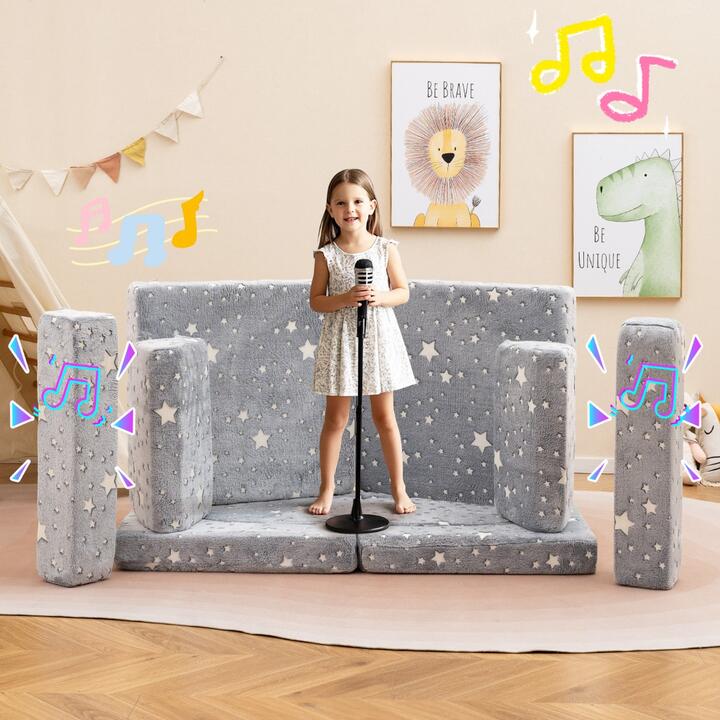 Featuring a collection of 5 shapes, this versatile set provides over 20 exciting combinations for your little ones to create a cozy corner of their own. As dusk turns to dark, watch kids rejoice as the enchanting patterns on the couch light up, creating a magical ambiance. For comfort and ease of upkeep, all the blocks are filled with resilient foam. Its fluffy flannel fabric cover is detachable and machine washable for maintaining its quality day after day. Designed with rambunctious play in mind, this modular couch comes with hidden zippers and rounded corners, and complies to OEKO-TEX, ASTM, and CPSIA standards, safeguarding kid’s every move. Giving it 48 hours, this 10 pcs modular kids play couch will puff to its full shape, ready for endless fun! Bullet Point:10 Pcs Modular Magic: A launchpad for creativity, this exciting kids play couch comes in 5 different sizes and shapes with 20+ possible combos. Kids can build fun fortresses and tunnels, or transform them into space ships, castles, or whatever they fancy for endless hours of active play. Glow in the Dark: Make bedtime magical with this glow-in-the-dark toddler couch. Simply put the sofa under bright sunlight for at least 10 minutes (the longer the better). As night falls, its delightful patterns lights up with a whimsical glow, comforting and captivating kids’ hearts. Create a Cozy Corner: Crafted from skin-friendly flannel fabric and filled with resilient high-density foam, this sectional sofa offers unmatched comfort for your little ones. Designed for easy maintenance, its detachable, machine-washable covers ensure lasting freshness and enduring appeal. Kids-friendly Design: Designed with active little ones in mind, this modular couch makes a safe haven for climbing, jumping, and all kinds of dynamic play with its hidden zippers and smooth, rounded corners. Fully compliant with OEKO-TEX, ASTM, and CPSIA standards, it’s a reliable choice for parents’ peace of mind. Ready in a Snap: Setting up this magical playroom furniture is fuss-free. Just unfold, carefully remove the wrapping, and wait patiently for 48 hours for the couch to take shape. You can also expedite the process or smooth the wrinkles with a garment steamer or a hairdryer. Specifications:Colour: Rainbow/Grey StarMaterial: Flannel Fabric, SpongeOverall Dimension: 130 x 71 x 42 cm (L x W x H)Suitable Age: 3+Net Weight: 7.5 kg Package Includes:1 x 10 Pcs Modular Kids Play Couch1 x User Guide Box Qty:1(May vary by batch)