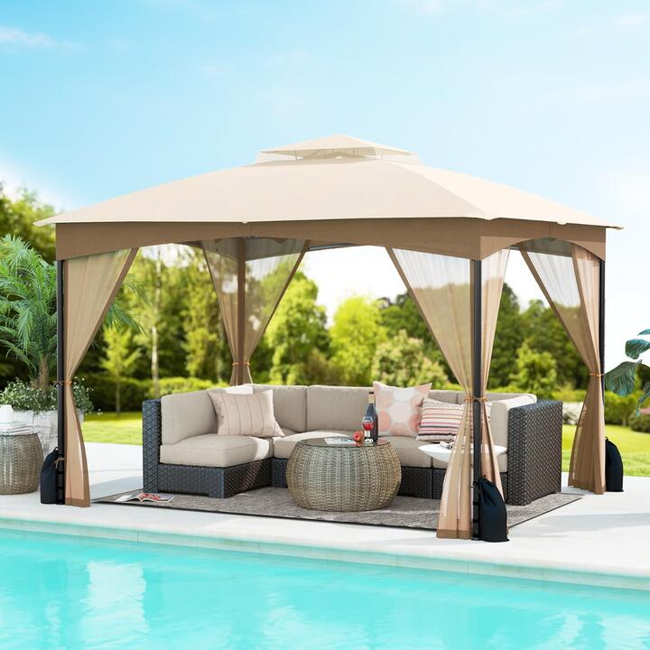 The outdoor gazebo measures 365 x 300 x 288 cm (L x W x H), creating an ample shaded space for a variety of outdoor activities including picnics, parties, and commercial events. It features mesh netting on 4 sides, which offer a panoramic view and keep unwanted guests out. The vented top is crafted with polyester fabric, which will shield you from harsh sunlight and light rain. Plus, the gazebo shelter adopts 2-section support poles that easily connect without the need of tools for easy assembly. The soft top pergola boasts heavy-duty beam structure, 8 supportive metal ribs, ensuring durability and stability. Moreover, the kit includes 4 sandbags to prevent the gazebo being blown away, which can be filled to add weight, along with anchoring plate bases and 8 metal stakes firmly securing the structure to the ground. (Note: Please do not use in extreme weather conditions.) Bullet Point: Strong Metal Frame: The patio gazebo's structure is built with strengthened beams and 8 metal ribs for outstanding stability. Additionally, the double roof canopy tent features 4 sandbags, base plates, and 8 ground stakes to provide exceptional resistance to wind.Ventilated Double-tier Roof: Crafted from high-quality polyester, the canopy is sun-protective, wear-resistant, anti-fading and water-resistant, ensuring long-lasting outdoor protection. Furthermore, the double-tier roof with a mesh vent helps stabilize the structure and enhances air ventilation.Detachable Mesh Netting: Equipped with all-side removable mesh netting, the heavy-duty gazebo not only protects against pesky small animals but also boosts ventilation and cools hot air. Each netting features a zippered door for effortless entry and exit.Large Size and Wide Usage: The pavilion shelter offers 365 x 300 cm of shade area, perfect for enhancing your outdoor relaxation. Also, the 2-tier gazebo features a ceiling hook to hang lighting or fans, making it perfect for hosting family get-togethers, BBQs, parties, and weddings or commercial events.User-friendly Installation: The supporting frame of the patio gazebo consists of 2 sections, which feature a screw-in structure for tool-free assembly. The canopy includes 3-level adjustable extension poles at the extended eaves to easily maintain a smooth, unwrinkled canopy top. Features: Mesh sidewalls with zippered doors offer easy access and excellent ventilationPremium polyester fabric is wear-resistant and sun-proofEasy to open the door with sliding hanging hooks and fixing strapsStrong center frame and reinforced beam offer superior stabilityAnchor base and ground stakes along with 4 sandbags improve the wind resistanceDetachable 2-section poles are easy to assemble without ladderExtended eaves come with 3-level extension tubes to flatten the fabric Convenient hook and loop fasteners allow you to effortlessly assemble the canopy topIncluded ceiling hook is suitable for hanging fan or lamp Specifications: Colour: Gray/KhakiMaterial: Polyester Fabric, Metal, MeshOverall Dimensions: 365 x 300 x 288 cm (L x W x H)Ground Clearance: 188 cmNet Weight: 29 kg Box qty: 1 Package Includes: 1 x Patio Gazebo 4 x Removable Sidewalls 4 x Sandbags 8 x Metal Stakes 1 x User’s Manual