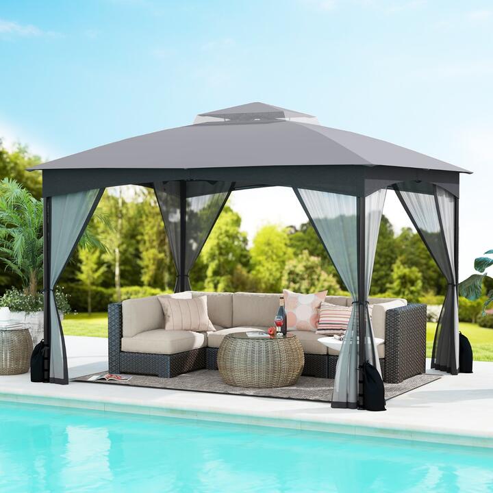 The outdoor gazebo measures 365 x 300 x 288 cm (L x W x H), creating an ample shaded space for a variety of outdoor activities including picnics, parties, and commercial events. It features mesh netting on 4 sides, which offer a panoramic view and keep unwanted guests out. The vented top is crafted with polyester fabric, which will shield you from harsh sunlight and light rain. Plus, the gazebo shelter adopts 2-section support poles that easily connect without the need of tools for easy assembly. The soft top pergola boasts heavy-duty beam structure, 8 supportive metal ribs, ensuring durability and stability. Moreover, the kit includes 4 sandbags to prevent the gazebo being blown away, which can be filled to add weight, along with anchoring plate bases and 8 metal stakes firmly securing the structure to the ground. (Note: Please do not use in extreme weather conditions.) Bullet Point: Strong Metal Frame: The patio gazebo's structure is built with strengthened beams and 8 metal ribs for outstanding stability. Additionally, the double roof canopy tent features 4 sandbags, base plates, and 8 ground stakes to provide exceptional resistance to wind.Ventilated Double-tier Roof: Crafted from high-quality polyester, the canopy is sun-protective, wear-resistant, anti-fading and water-resistant, ensuring long-lasting outdoor protection. Furthermore, the double-tier roof with a mesh vent helps stabilize the structure and enhances air ventilation.Detachable Mesh Netting: Equipped with all-side removable mesh netting, the heavy-duty gazebo not only protects against pesky small animals but also boosts ventilation and cools hot air. Each netting features a zippered door for effortless entry and exit.Large Size and Wide Usage: The pavilion shelter offers 365 x 300 cm of shade area, perfect for enhancing your outdoor relaxation. Also, the 2-tier gazebo features a ceiling hook to hang lighting or fans, making it perfect for hosting family get-togethers, BBQs, parties, and weddings or commercial events.User-friendly Installation: The supporting frame of the patio gazebo consists of 2 sections, which feature a screw-in structure for tool-free assembly. The canopy includes 3-level adjustable extension poles at the extended eaves to easily maintain a smooth, unwrinkled canopy top. Features: Mesh sidewalls with zippered doors offer easy access and excellent ventilationPremium polyester fabric is wear-resistant and sun-proofEasy to open the door with sliding hanging hooks and fixing strapsStrong center frame and reinforced beam offer superior stabilityAnchor base and ground stakes along with 4 sandbags improve the wind resistanceDetachable 2-section poles are easy to assemble without ladderExtended eaves come with 3-level extension tubes to flatten the fabric Convenient hook and loop fasteners allow you to effortlessly assemble the canopy topIncluded ceiling hook is suitable for hanging fan or lamp Specifications: Colour: Gray/KhakiMaterial: Polyester Fabric, Metal, MeshOverall Dimensions: 365 x 300 x 288 cm (L x W x H)Ground Clearance: 188 cmNet Weight: 29 kg Box qty: 1 Package Includes: 1 x Patio Gazebo 4 x Removable Sidewalls 4 x Sandbags 8 x Metal Stakes 1 x User’s Manual