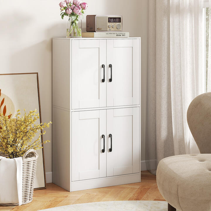 Featuring 2 spacious cabinets and dual 5-position adjustable shelves, the storage cabinet provides large storage space. Moreover, this cabinet comes with metal handles and allows for multi-door convenience. User-friendly details such as screw hole covers maintain a sleek appearance, while protective foot pads prevent floor scratches. Safety is a priority with 2 anti-tipping kits and a sturdy base that promotes overall stability. This stylish cabinet is suitable for various spaces including bathroom, kitchens, dining rooms, living areas, entryways, and studies, seamlessly complementing different aesthetics. Ample Storage Capacity: The bathroom cabinet includes 2 roomy cabinets that are ideal for organizing your bathroom essentials. Additionally, this cabinet comes with multiple doors and metal handles, ensuring convenient access to stored items.Flexible Adjustable Shelves: For optimal organization, the bathroom cabinet features a total of dual 5-position adjustable shelves. Each shelf can be easily modified by 3.2 cm increments or directly removed to accommodate items of various sizes.Ensured Safety & Stability: Designed with your safety in mind, the storage cabinet is equipped with 2 anti-tipping kits and a thickened base to ensure secure usage. These features provide peace of mind and make it a reliable addition to any room.Elegant Design: Enhance your home decoration with a storage organizer that doesn't compromise on functionality. Thoughtful details like screw hole covers maintain its sleek exterior, ensuring it complements any room's aesthetic.Perfect for Any Setting: The 60 x 30 x 110 cm (L x W x H) sideboard cabinet is not only perfect for use in bathrooms but also adapts seamlessly into dining rooms, living areas, kitchens, and studies. Also, its protective foot pads prevent scratches to floors. Specification:Color: Black/WhiteMaterial: Engineered Wood, MDFOverall Dimensions: 60 x 30 x 110 cm (L x W x H)Inner Size of Each Cabinet: 57.5 x 28.5 x 50 cm (L x W x H)Size of Each Shelf: 57.5 x 28.5 cm (L x W)Spacing of Adjacent Adjustable Positions: 3.2 cmLoad Capacity of Each Tier: 15 kgNet Weight: 20 kgBox QTY: 1(May vary by batch)Is Assembly Required: Yes Package Includes:1 x Storage Cabinet1 x User Guide