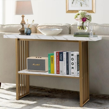 Bring a new hallway appearance with this modern entryway table. This faux marble tabletop table brings modern flair and stores a variety of things, giving you a tidy space. Made of premium materials, it is sturdy and durable. Plus, the adjustable feet add extra stability. You can fix it on the wall for reliable use. The console table is suitable for the living room, foyer and other places. Bullet Point: Modern Look: The faux marble top and gold-coloured frame create a modern appearance to live up to your home. Besides, the smooth surface is easy to clean, allowing you to quickly wipe it down to make it look nice. Sturdy Metal Legs: The console table legs are made of high-quality metal, which has great sturdiness and provides strong support. In addition, the powder coating finish increases rust resistance and durability. Excellent Stability: Thanks to the anti-toppling device, the long side table can be firmly fixed on the wall to prevent children or pets from accidentally knocking over, which greatly improves safety and stability. Wide Application: The modern console table works perfectly as a sofa table, vanity table, entryway table etc., and fits flawlessly on different occasions. Plus, it comes with a spacious 110cm tabletop to hold various items. Easy Assembly: With a step-by-step installation manual and needed parts in the package, the narrow sofa table is easy to assemble. The overall dimensions: are 110cm x 30cm x 81cm(L x W x H); the weight capacity of the tabletop: is 75kg. Features: Reinforced metal structure for excellent sturdiness Spacious tabletop to keep various objects Anti-tipping device greatly promotes stability and safety Adjustable feet keep it balanced on slightly uneven floors Perfect for many places like corridors, living rooms, etc Well-illustrated manual helps you complete the assembly Smooth surface for simple maintenance Specifications: Colour: White + Gold/White +Black Material: MDF, Metal Overall Dimension: 110 x 30 x 81 cm (L x W x H) Width between Support Feet (included): 80 cm Weight Capacity of Tabletop: 75 kg Net Weight: 8.5 kg Package Includes: 1 x Side Table 1 x User Guide Box Qty:1(May vary by batch)