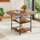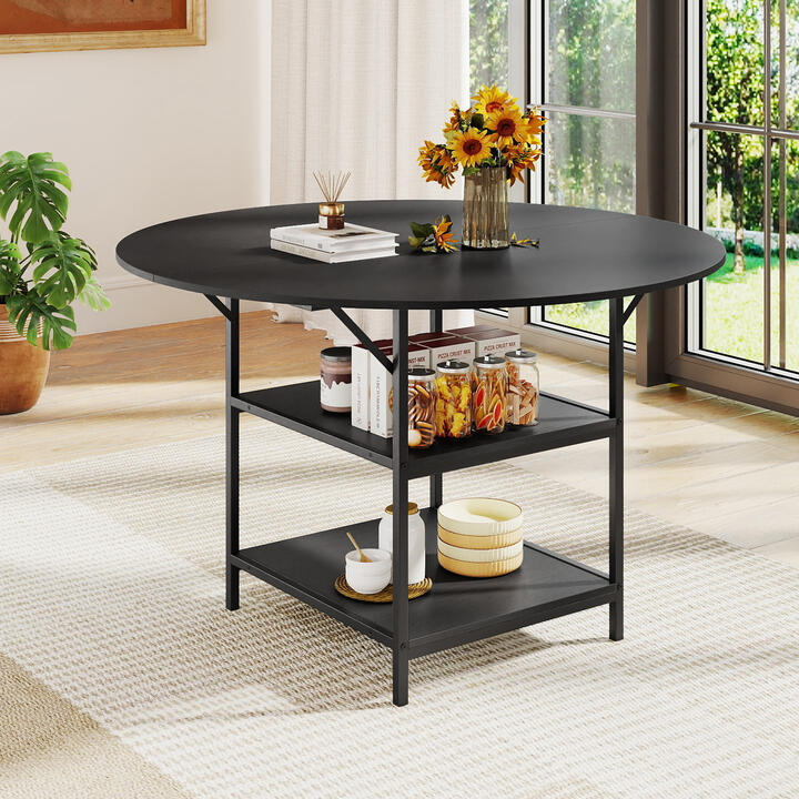 Featuring ample tabletop space and 2 convenient open storage shelves, this minimalist table keeps essentials like tableware and snacks within easy reach while keeping your dining area clutter-free. The sturdy metal frame and non-slip foot pads ensure lasting stability and safety, while smooth rounded edges provide a family-friendly touch. Designed with a sleek, waterproof surface for easy cleaning, this versatile large round table combines elegant style, smart storage, and hassle-free maintenance—making it an ideal centerpiece for both small and spacious homes. Bullet Point:120 CM Large Round Tabletop: Make every meal memorable around the 120 cm spacious round tabletop. Whether hosting an intimate dinner for 4 or a lively gathering for 6, this large dining table provides a cozy space for family and friends to enjoy comfortable conversation.Additional Storage Space: The 2 spacious open shelves beneath the round dining table provide easy access to all your essentials—store tableware, beverages, cups, and snacks right where you need them. Keep your dining table organized and your gatherings stress-free.Safety Meets Stability: Experience peace of mind with our heavy-duty metal frame, designed to support your dinette table through years of family meals. Non-slip foot pads keep your table stable and secure, while smooth round edges effectively prevent bumps or scratches.Modern Style for Any Space: This round dining table blends sleek modern style with practical design, adding a touch of elegance to your home. Its minimalist look fits seamlessly into any kitchen, dining room, or studio apartment, making it a must-have dining table for small and large spaces alike.Hassle-free Setup & Maintenance: No need to worry about complex setups. This kitchen table comes with clear instructions for easy assembly. Its smooth waterproof surface easily resists spills and stains, so you spend less time cleaning and more time enjoying meals with loved ones. Specification:Color: Brown+Black/BlackMaterial: Engineered Board, MetalProduct Dimensions: 120 x 76 cm (Dia. x H)Shelf Size: 60 x 50 cm (L x W)Tabletop Weight Capacity: 100 kgEach Shelf Weight Capacity: 20 kgNet Weight: 22.5 kgBox QTY: 1(May vary by batch)Is Assembly Required: Yes Package Includes:1 x Dining Table1 x User’s Manual