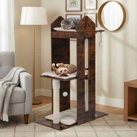 Our 120 cm tall modern cat tree features 3 roomy platforms, offering plenty of pace for your feline to climb, perch, and nap on soft, inviting cushions. Each level is designed for relaxation, with plush fabric that is gentle on furry paws and removable cushions for easy cleaning. Moreover, it includes natural sisal scratching posts, helping satisfy scratching instincts, paired with plush dangling balls to keep your cat entertained and active throughout the day. A rustic brown finish and uniquely modern silhouette transform this cat tree into a decorative accent that naturally complements your living space, making it a perfect combination of pet entertainment center and home decoration. Bullet Point: Multi-Level Activity Space: This 120 cm tall cat tree features 3 spacious platforms with padded cushions, offering cozy spots for lounging, overlooking, napping, and playing. Plus, it includes 2 plush dangling balls, enticing playful interaction and adding more fun. Meet Scratching Needs: The kitten tower is equipped with sisal scratching posts that satisfy your cat's instinct to scratch and stretch. Covered with natural sisal ropes that are scratch-resistant, wear-resistant, safe and healthy, these posts prioritize your pet's well-being. Comfy Lying Experience: Soft padded cushions cover each platform, offering superior comfort for your pet. Every cushion is wrapped in skin-friendly plush fabric that feels gentle and inviting. Moreover, the cushions are removable and washable, making cleaning a breeze. Thoughtful Details for Safety: This cat furniture is designed with safe round corners to prevent accidental bumps or injuries. The easy-cleaning surface makes daily upkeep hassle-free, and anti-scratch foot pads protect your floors while enhancing overall stability. Stylish Appearance: The unique shape and rustic brown finish transform this modern cat tree into more than just a pet accessory, doubling as a stylish piece of decoration. Its eye-catching appearance blends effortlessly into your living room or bedroom. Features: 3 spacious platforms provide ample climbing and resting space Padded cushions bring warmth and ultimate comfort to your lovely cats Cushions covered in skin-friendly plush fabric, ensure cozy comfort Removable and washable cushions for easy maintenance 2 plush dangling balls offer interactive play, replaceable Sisal scratching posts allow cats to grind claws and release instincts Natural sisal material is safe and wear-resistant Safe round corners prevent accidental bumps Anti-scratch foot pads protect floors and add stability Smooth veneered wooden surface is easy to clean with a wipe cloth The rustic brown finish and unique shape create a cozy and inviting look Specifications: Colour: Rustic Brown Material: Engineered Board, MDF, Plush Fabric, Sponge, Sisal Product Dimensions: 80 x 40 x 120 cm Weight Capacity of Each Layer: 10 kg Net Weight: 14 kg Is Assembly Required: Yes Box Qty: 1 Package Includes: 1 x Wooden Cat Tree 1 x User's Manual