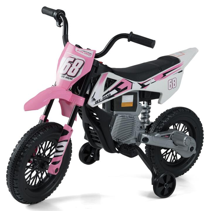 Powered by robust dual 25 W motors and a dependable 12 V/4 Ah battery, your little adventurer can enjoy extended rides at a secure speed. It's designed for easy mastery with simple controls and features like one-button start and twist-grip throttle, making every ride smooth with its advanced spring suspension and enduring wheels. Watch your child's confidence soar as they transition from training wheels to two-wheeled thrills. The fun hits a new level with a built-in music system, transforming their bike into a rolling DJ booth. Ideal for kids aged 3-8 and up to 30 kg, adhering strictly to safety standards. Sporting a genuine dirt bike look, this kids motorcycle stands out as the perfect gift that combines excitement, style, and safety! Bullet Point:Powerful & Safe First Ride: Dual 25 W motors and a 12V/4 Ah rechargeable battery give this 12V motorcycle for kids long time of continuous fun at a gentle 3-5 km/h speed. Parents love that the low speed still lets kids feel the thrill while staying in control on sidewalks or rubber tracks. Kid-friendly Controls: A one-button start, twist-grip throttle and sturdy foot pedals make the ride on motorbike easy for kids to master in minutes. Spring suspension, wear-resistant wheels, and soft start and stop design keep every cruise steady and bump-free for new riders. Grows with Your Child: The electric motorcycle comes with non-grounded training wheels that hover until balance fades, then gently catch the tip. When confidence kicks in, the detachable design lets the bike grow from balance aid to two-wheel freedom. Rolling Dance Party: The 7 built-in songs and wireless connection capability turn this battery-powered dirt bike into a rolling DJ booth. A volume knob keeps the playground playlist fun without drowning out backyard peace. Perfect for Little Ones: This kids ride-on toy complies with AS/NZS ISO 8124 standard for ages 3-8 years and supports up to 30 kg. With an authentic dirt bike look and race-style front head, the kids ride-on motorcycle will be a great gift for both boys and girls. Specification:Color: Green/Pink/RedMaterial: PP, MetalOverall Dimensions: 107 x 56 x 70 cm (L x W x H)Seat Height: 54.5 cmSuitable Age: 3-8 Years OldBattery: 12V/4.5 AhSpeed: 3-5 km/hWeight Capacity: 30 kgNet Weight: 11.5 kgBox QTY: 1(May vary by batch)Is Assembly Required: Yes Package includes:1 x Electric Motorcycle1 x Adapter1 x User Manual