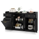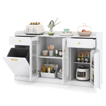 This kitchen sideboard boasts a spacious tabletop with raised edges to keep trays, coffee stations, or serving platters in place. 2 fluted tempered glass doors add modern texture while offering a stylish view of dinnerware, glassware, or decorations. It also includes 2 drawers, 2 adjustable shelves and 2 door shelves for organized storage. A hidden tilt-out compartment keeps a trash can tucked away yet easy to access, helping maintain a clean look in your kitchen. Built for home use, this coffee bar cabinet features 2 anti-toppling devices to support added stability when placed in busy family spaces. Wide Top with Raised Edges: This 140 cm buffet cabinet offers a spacious countertop measuring 137.5 x 32.5 cm (L x W) for serving, coffee stations, or decorations. The 6 cm raised edges help prevent items from falling off.Hidden Trash Can Storage: Equipped with a trash can cabinet, this sideboard is designed to make your kitchen neat and aesthetically pleasing. The secure tilt-out design conceals the trash can from view while staying quick to access. It fits a 44 L trash can (not included).Generous Storage Space: This kitchen storage cabinet features 2 enclosed cabinets and 2 drawers to store utensils, small appliances, etc. 2 adjustable shelves, each with 3 height options, let you customize the storage space for plates and pantry goods. Plus, the side cabinet includes 2 door shelves with anti-falling bars for quick-grab essentials. Modern Style & Versatile Use: Fluted tempered glass doors add elegance and durability for daily use, complemented by golden handles that elevate the entire silhouette. This modern coffee bar cabinet blends well with your kitchen, dining room, living room, etc.Upgraded Stability & Safety: This wooden sideboard comes with 2 anti-toppling devices, allowing you to secure the cabinet to the wall firmly. The magnetic catches keep doors close tightly, while the soft-close hinges help prevent slamming, enjoy quieter daily use. Specification: Color: White/BlackMaterial: MDF, Metal, Tempered GlassOverall Dimensions: 140 x 34 x 80 cm (L x W x H)Countertop Dimensions: 137.5 x 32.5 cm (L x W)Internal Dimensions of Drawer: 35 x 28.5 x 11 cm (L x W x H)Internal Dimensions of Center Cabinet : 55 x 26 x 65 cm (L x W x H)Internal Dimensions of Side Cabinet: 40 x 19 x 53.5 cm (L x W x H)Upper Door Shelf Dimensions: 32 x 9 x 22 cm (L x W x H)Lower Door Shelf Dimensions: 32 x 9 x 24 cm (L x W x H)Maximum Trash Can Size: 36 x 30 x 41 cm (L x W x H)Weight Capacity of Countertop: 50 kgWeight Capacity of Each Drawer: 5 kgWeight Capacity of Each Shelf: 5 kgNet Weight: 40 kgBox QTY: 1(May vary by batch)Is Assembly Required: Yes PackageIncludes: 1 x Buffet Cabinet1 x Instruction