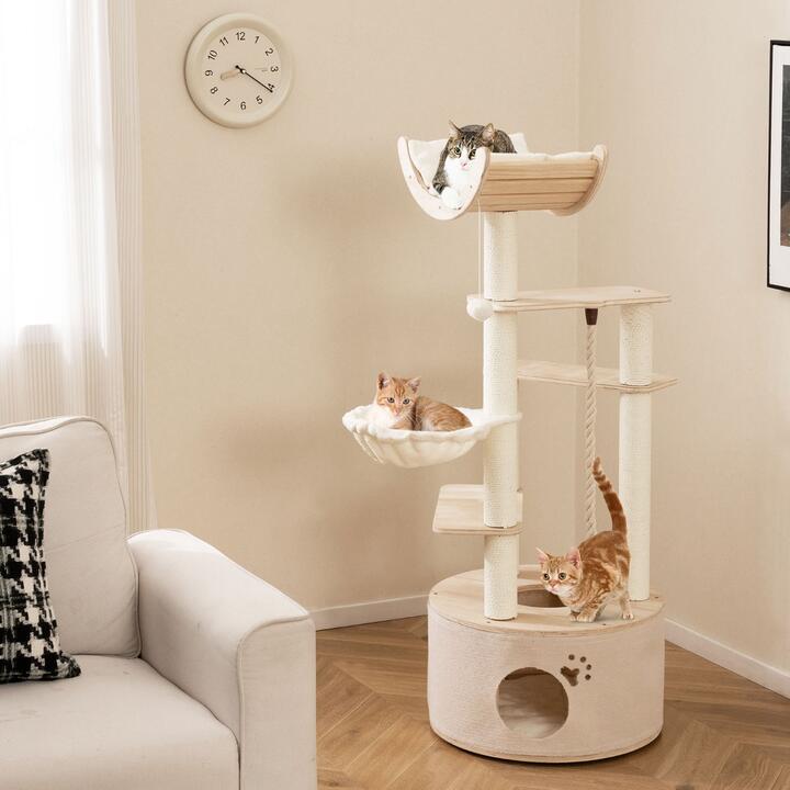 Our deluxe wooden cat tree boasts a solid plywood frame that provides unmatched durability and stability thanks to its robust base and anti-slip foot pads. Your cat will love the curved top perch with a padded cushion, perfect for surveying their kingdom, and the privacy of the comfy cat condo equipped with a cat hole, ideal for playful peeking. Additionally, the hammock offers a novel lounging experience. For active cats, the tree presents numerous interactive features, such as scratching posts, a plush dangling ball, and a hanging rope to engage their natural scratching instincts and playful nature. Moreover, comfort is never compromised, as the tree is adorned with ultra-soft, skin-friendly plush cushions for ultimate relaxation. Maintenance is a breeze with detachable, washable cushions and a removable condo cover, simplifying the cleaning process. Our kitten furniture is designed to provide your feline friend with an engaging, comfortable, and safe environment. Stable & Reliable Construction: The support frame is crafted from a solid plywood frame, paired with a natural pine wood perch, offering a reliable play and rest area for your furry friends. Plus, there are anti-slip foot pads for floor protection and round corners for enhanced safety. Multi-Level Playground: The 141 cm tall cat tree featuring a top-level arched viewing platform, a secluded cat condo with a top cat hole, a cozy basket, and 3 wide jumping platforms, designed to cater to your cat's climbing and exploration instincts while providing a safe space for lounging. Interactive Entertainment: Equipped with fully-wrapped scratching posts, a plush dangling ball, and a hanging rope, this interactive cat tree turns every session into an exciting and engaging adventure, perfect for your cat's scratching urges and keeping them entertained for hours. Luxurious Comfort: Wrapped in skin-friendly plush fabric and padded cushions, this wooden kitten tower provides an exceptionally soft and inviting area for your cat to rest. Plus, its unique structured design also complements your home decoration. Easy Maintenance & Assembly: The padded cushions on the condo and perch are detachable and washable, while the condo cover is also detachable, making maintenance a breeze, keeping clean and tidy. In addition, with its simple structure and clear illustrations, it is easy to set up.