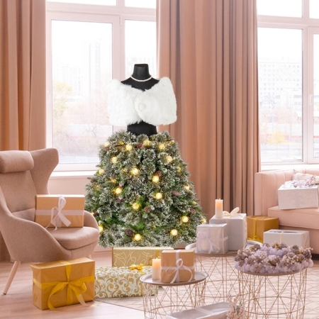 Designed in a dress form with 465 lush branch tips, the artificial Christmas tree looks distinctive. With silver tipped pine needles, snowy PVC leaves and 36 natural pine cones, the hinged dress form Xmas tree creates an added wintry atmosphere. Those branch tips are made of fire-proof PVC for a safe expeirence. Additionally, the mannequin with a beautiful white shawl, a pearl brooch and a necklace create a luxurious appearance, making the Xmas tree a perfect choice to add a stylish twist to our festive decorations. Also, the 50 LED light balls exude warm ambiance that will enhance any holiday setting. These light balls with diamond-like flower shells refract dazzling luster to double as decorative elements when unlit. Plus, the upgraded metal base comes with a pre-installed bolt to avoid mismatched hole. Thanks to the hinged structure, the branches will auto-expand to save your time. During the assembly, 2 pairs of gloves are provided to protect your hands. Bullet Point:Creative Mannequin Tree: Adding to the allure of our artificial Xmas tree is the elegant mannequin adorned with a beautiful white shawl, a pearl brooch, and a necklace, allowing you to DIY your unique holiday tree. The lower part is designed in a dress form to create a truly centerpiece for holiday celebrations. Echo the Theme of Winter: The pre-lit Xmas tree features silver-tipped pine needles, snowy leaves, and 36 snowy natural pine cones, exuding a wintry charm that will captivate your guests. The fire-proof, non-fading and non-allergic PVC branch tips allow you to enjoy the beauty of the season without any concerns. More Captivating Lights: Adorned with 50 LED light balls, the mannequin Christmas tree exudes a soft, inviting glow that will create a magical atmosphere. Additionally, the diamond-like flower shells of these light balls serve as captivating decorative elements even when unlit. Hassle-free Assembly: With the innovative hinged structure of our dress form tree, the branches will automatically expand. Also, the 2-section removable trunk allows for easy installation and storage. Moreover, 2 pairs of gloves are provided to protect your hands, ensuring a comfortable experience. User-friendly Metal Base: The upgraded metal base comes with a pre-installed bolt to ensure a secure fit and avoid any mismatched holes, which is labor-saving. Featuring non-slip foot pads, the folding metal stand will enhance the stability and keep your floor safe from unwanted damage. Specifications:Colour: Green & WhiteMaterial: PVC, MetalTree Height: 150 cmTree Width: 101 cmDiameter of Stand: 45 cmNumber of Branch Tips: 465Number of LED Lights: 50Number of Pine Cones: 36Number of Sections: 2Net Weight: 7 kg Package Includes:1 x Christmas Tree2 x Pairs of Gloves1 x User Guide Box Qty:1(May vary by batch) Is Assembly Required: Yes