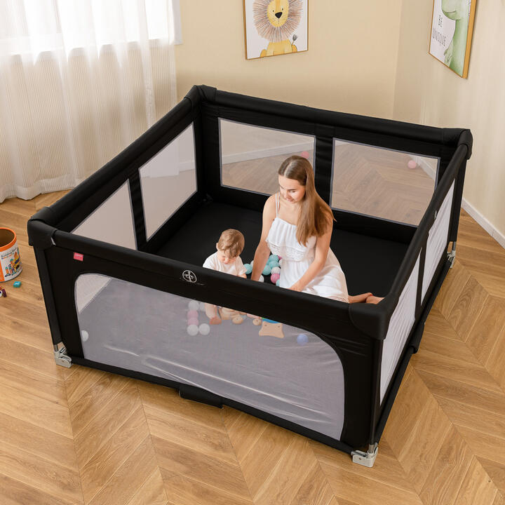 This large playard offers enough space for your little one to explore, and joints are wrapped by foam to prevent the baby from hitting the head. Parents can easily interact with their children through the see-through mesh. The play yard includes 50 ocean balls and 4 pull-up rings for physical activity and motor skills development. This foldable play pen requires no assembly, making it convenient for transport and storage with the included carry bag. Bullet Point:Spacious Play Area: This large 150cm x 150cm playpen provides you baby roomy safe space to crawl, walk, stand and play freely. It's designed for children up to 3 years old. Safety Enclosed: All top joints are equipped with anti-collision foam pads, which helps prevent injuries by cushioning the impact if your little one hit the head. And the seamless fit ensures no gaps leading to pinching, ensuring maximum safety for your child. Safe and Robust Materials: The sturdy metal frame (tube thickness 1 mm) makes it a long-lasting addition to your child’s playtime essentials. Plus, the anti-wear Oxford fabric is also BPA-free, and 360° see-through mesh cloth allows parents to interact with the little ones at anytime, giving the baby enough sense of security. Easy Access and Engaging Fun: This play yard is equipped with a convenient zip-open side door that offers easy in-and-out for babies and toddlers. Included accessories are 50 colorful ocean balls and 4 pull-up rings to promote physical activity and motor skills development. Foldable and Portable Design: No assembly needed when you receive this play pen. It sets up and folds down simply. It comes with an included carry bag, convenient for transport and storage. Whether at home, or at a picnic, this versatile play pen is your go-to solution for safe and contained play. Specifications:Colour: Grey/BlackMaterial: Oxford Fabric + Mesh Cloth + MetalOverall Dimension: 150 cm x 150 cm x 76.5 cm (L x W x H)Side Door Dimension: 120 cm x 54 cm (L x H)Suitable Age: 0-3 years oldNet Weight: 7 kg Package includes:1 x Baby Playpen50 x Ocean Balls4 x Pull-up Rings1 x Carry Bag1 x User Guide Box Qty: 1(May vary by batch) Is Assembly Required: Yes