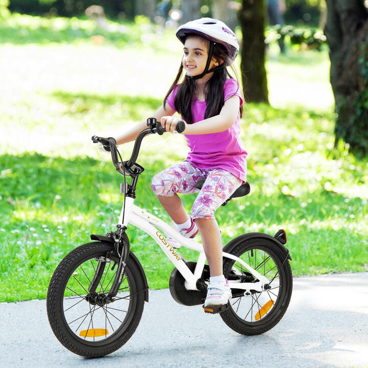 The adjustable handlebar and seat fit children of different ages and heights. Whether your child is just learning to ride or is ready to explore around, this bicycle provides a safe and enjoyable experience. The handbrake and coaster brake enable your child to easily brake. It also comes with 2 removable training wheels, allowing beginners to gain confidence and keep balance. Featuring 2 premium rubber tires and a strong metal frame, this bike ensures excellent strength and stability. Moreover, the bicycle features front and rear reflectors to enhance visibility during low-light conditions. The kickstand (only for 18-inch bikes) is also included for parking. It also has passed AS/NZS 1927 and CPN No.6 of 2004 certification. Get your child ready for a fun and independent riding adventure! Bullet Point: Adjustable Handlebar & Seat: The height-adjustable children bicycle can grow with your little one aged 3-4/3-5/4-7/4-8 years old. The handlebar height can be adjusted from 66 cm to 69 cm/74 cm to 77 cm/80 cm to 83 cm/ 83 cm to 86 cm, while the saddle height can be adjusted from 43 cm to 49 cm/ 49.5 cm to 55 cm/ 53 cm to 62.5 cm/ 57.5 cm to 66.5 cm. Dual Brake System for Stopping: The hand brake is easy to control with shorter grip distance, bringing kids much convenience. The coaster brake makes it convenient to stop by pedaling backward. Additionally, kids can also use the handlebar to control the direction while riding. High Quality Wheels for Riding: The kids bike is equipped with 2 shock-absorbing and wear-resistant rubber wheels for a smooth and stable riding experience. Plus, it also has 2 training wheels to help beginners keep balance and gain confidence. If needed, the training wheels can be removed to let young riders enjoy riding fun. Safe & Enduring Construction: The enclosed chain guard prevents pinching. The reflectors add extra safety. It also features AS/NZS 1927 and CPN No.6 of 2004 certification. Moreover, the solid metal frame withstands multiple bumps for long-lasting service life. The kickstand (only for 18-inch bikes) allows your kids to ride more courageously. Simple Assembly & Dimensions: The bike is pre-assembled, making installation a breeze. The finished dimensions are Note: Please measure kid’s INSEAM and compare with SADDLE HEIGHT to check if the rider can touch the ground. Features: Adjustable handlebar and seat make it ideal for 3-4/3-5/4-7/4-8 years old kids Designed with dual brake methods: hand brake and coaster brake Quick release lever to adjust or fix the seat height The 5-layered rubber tires for excellent anti-slip performance AS/NZS 1927 and CPN No.6 of 2004 certification for safe use 2 detachable training wheels for added safety and steadiness Front and rear reflectors keep kids visible in low-light conditions Non-slip pedals and ergonomic seat for effortless and cozy riding Pre-assembled design and detailed user manual for quick assembly Solid metal frame for excellent strength and sturdiness Bike bell provides kids with added fun *Comes with a kickstand to park (Only for 18-inch bikes) Specifications: Color: Purple/ Red/ WhiteMaterial: Metal, Rubber, PP, TRP, PVC —-(12 inches)—-Product Dimension: 86 cm x 51 cm x 66-69 cm (L x W x H)Saddle Height: 43-49 cmSuitable Height: 80-105 cmInseam Size: 41-47 cmWheel Size: 30 cmSuitable Age: 3-4 Years OldWeight Capacity of Seat: 60 kgNet Weight: 8.5 kgGross Weight: 10 kg —-(14 inches)—-Product Dimension: 104 cm x 51 cm x 74-77 cm(L x W x H)Saddle Height: 49.5-55 cmSuitable Height: 95-110 cmInseam Size: 47-53 cmWheel Size: 36 cmSuitable Age: 3-5 Years OldWeight Capacity of Seat: 60 kgNet Weight: 9.5 kgGross Weight: 11 kg —-(16 inches)—-Product Dimension: 114 cm x 54 cm x 80-83 cm(L x W x H)Saddle Height: 53-62.5 cmSuitable Height: 105-130 cmInseam Size: 51-60 cmWheel Size: 40 cmSuitable Age: 4-7 Years OldWeight Capacity of Seat: 60 kgNet Weight: 10.5 kgGross Weight: 12 kg —-(18 inches)—-Product Dimension: 128 cm x 54 cm x 83-86 cm (L x W x H)Saddle Height: 57.5-66.5 cmSuitable Height: 120-150 cmInseam Size: 55-64 cmWheel Size: 45 cmSuitable Age: 4-8 Years OldWeight Capacity of Seat: 60 kgNet Weight: 11.5 kgGross Weight: 13.5 kg Box QTY: 1 Package Includes: 1 x Kids Bicycle 1 x User Manual