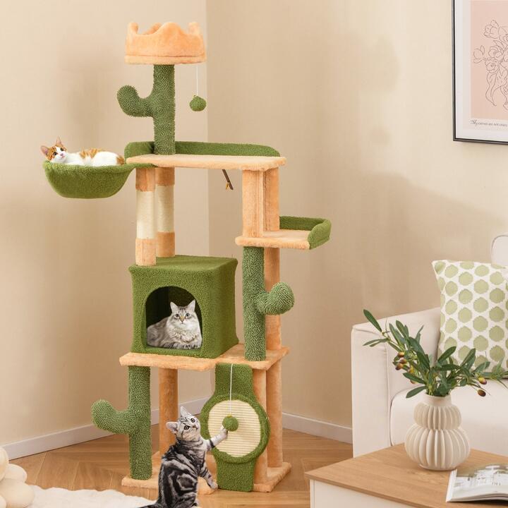 The indoor pet condo furniture stands out with its unique appearance, which features vivid cactus-inspired posts. Equipped with a crown-shaped perch, the cactus cat tree offers a safe and cozy elevated spot to overlook their domain. The plush perch with sponge filling offers a cloud-like experience. Also, the large condo is a cozy hideaway where your cats can escape the hustle and bustle of the world. In addition, the cat tower comes with a rotatable hanging basket, allowing you to easily change the position of the basket to suit your cats' preferences. Additionally, the cat tree includes 2 jumping platforms with raised edges, which not only provide an elevated vantage point for curious cats but also offer a sense of security. To release cats' hunting and scratching instincts, the versatile kitty playground features sisal scratching posts, a target-shaped sisal board and hanging pompoms. Furthermore, the tall cat climbing stand prioritizes safety with an anti-tipping device. Bullet Point:Eye-catching Appearance: The multi-level cat tree features support pillars designed to resemble cactus, making it a focus point to your home. Additionally, the orange crown-shaped perch and green main structure complement each other, creating the illusion of an oasis in the desert. Multiple Relaxing Options: The cat tower comes with a plush perch that offers elevated vantage points for your cats to survey their kingdom. Below, a cozy condo provides private hideaways for peaceful cat naps. Plus, a hanging basket offers another spot for your cats to curl up in comfort. Kitty's Favorite Playground: With sisal-wrapped scratching posts and board, your feline friends can keep their claws healthy, saving your furniture from scratches. In addition, 2 jumping platforms with elevated rails encourage safe exploration, while 2 playful pompoms add an extra element of fun. Stability at the Core: Featuring multiple supporting posts and a wide base, the tall kitty play center boasts a stable foundation. Furthermore, an anti-tipping device is included for added security, ensuring that even the most active cats can play without any risk of toppling over. Ultimate Coziness for Kitties: The whole cat climbing frame is enveloped in premium plush fabric to offer a gentle touch to your beloved pets. More than that, the perch is filled with sponge to enhance cats' lying experience. Also, the cactus posts are made of ultra soft and non-shedding moppy fabric. Specifications:Colour: Green + OrangeMaterial: Engineered Wood, Sisal, Moppy Fabric, Plush FabricOverall Height: 160 cmBase Size: 49 cm x 41 cm(L x W)Cat Condo Size: 31 cm x 31 cm x 31 cm (L x W x H)Plush Perch Diameter: 30 cmEach Tier Weight Capacity: 5 kgNet Weight: 12 kg Package Includes:1 x Cat Tree1 x Anti-tipping Device1 x Instruction Box Qty:1(May vary by batch) Is Assembly Required: Yes